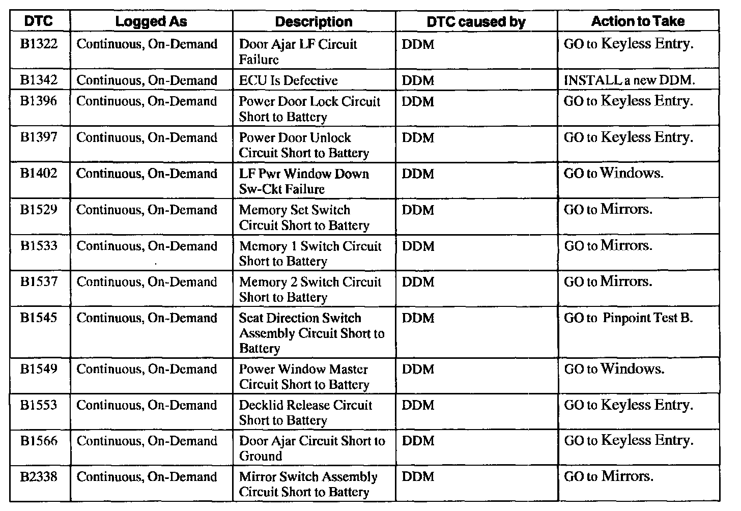 Driver Door Module (DDM) Diagnostic Trouble Code (DTC) Index