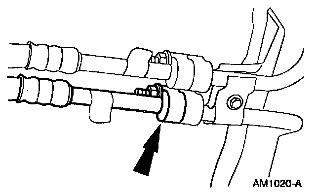 5. Disconnect the A/C compressor to condenser discharge line from the A/C condenser core. Refer to peanut fitting connect and disconnect general procedure. Peanut Fitting Connect and Disconnect Procedure