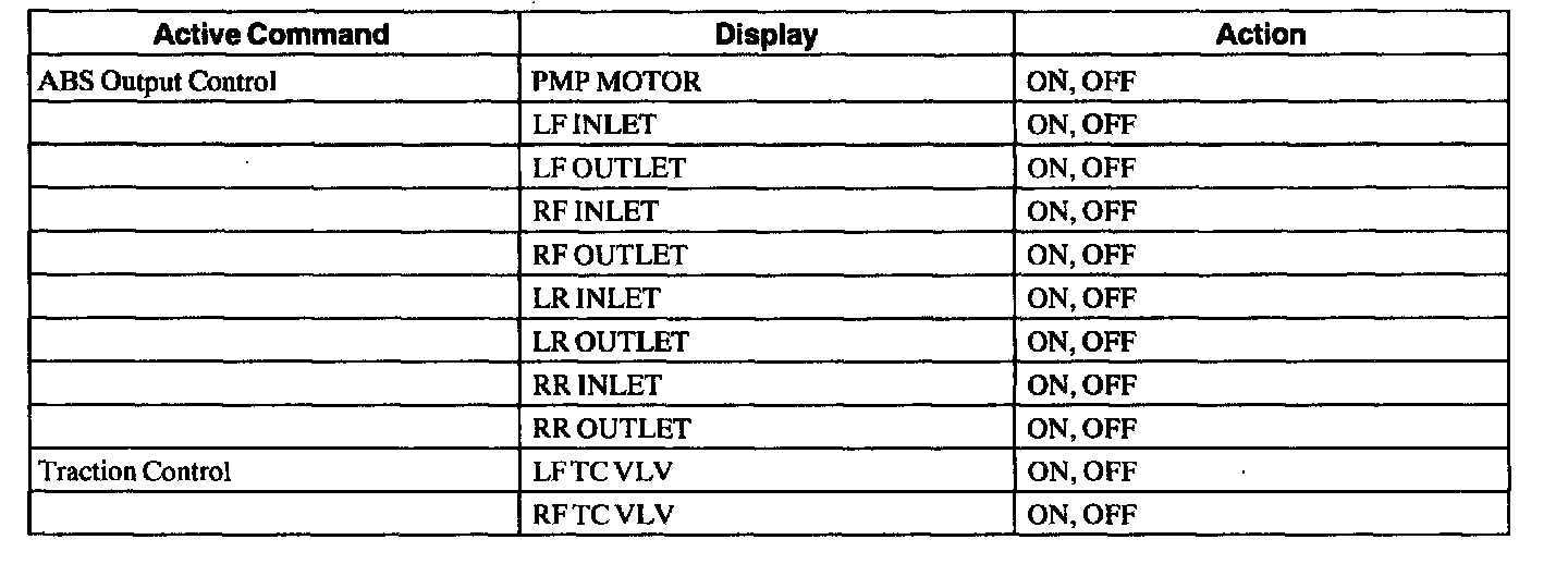 Anti-Lock Brake Control Module Active Command IndexNOTE: When pump motor or values are turned on, the display on scan tool remains until the scan tool operator switches states, but the motor and valves are turned on for only approximately three seconds to avoid overheating.