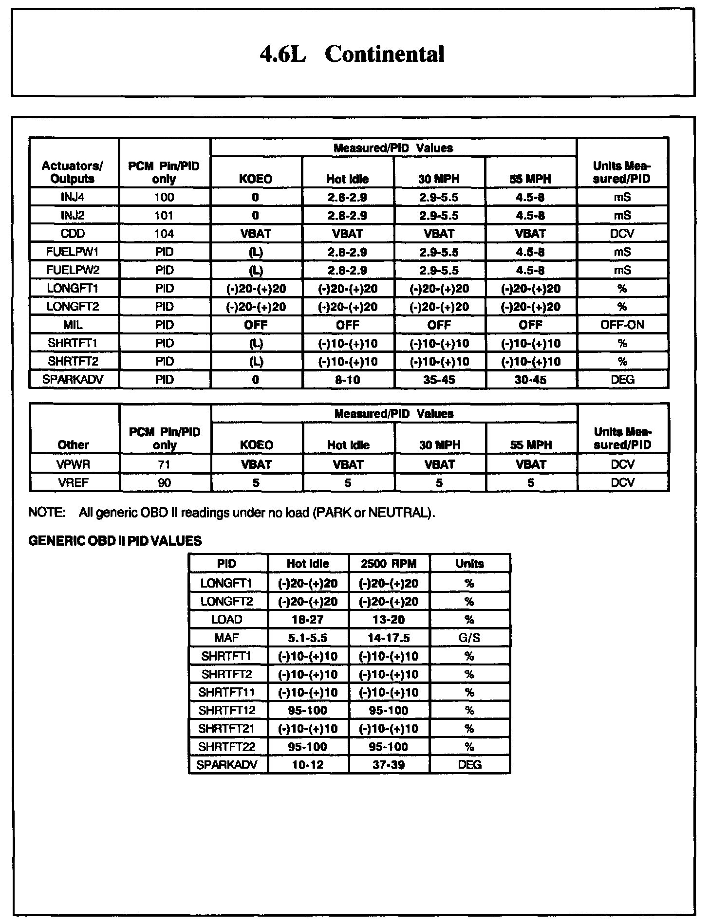 Normal Scan Data Values - Includes PIDs