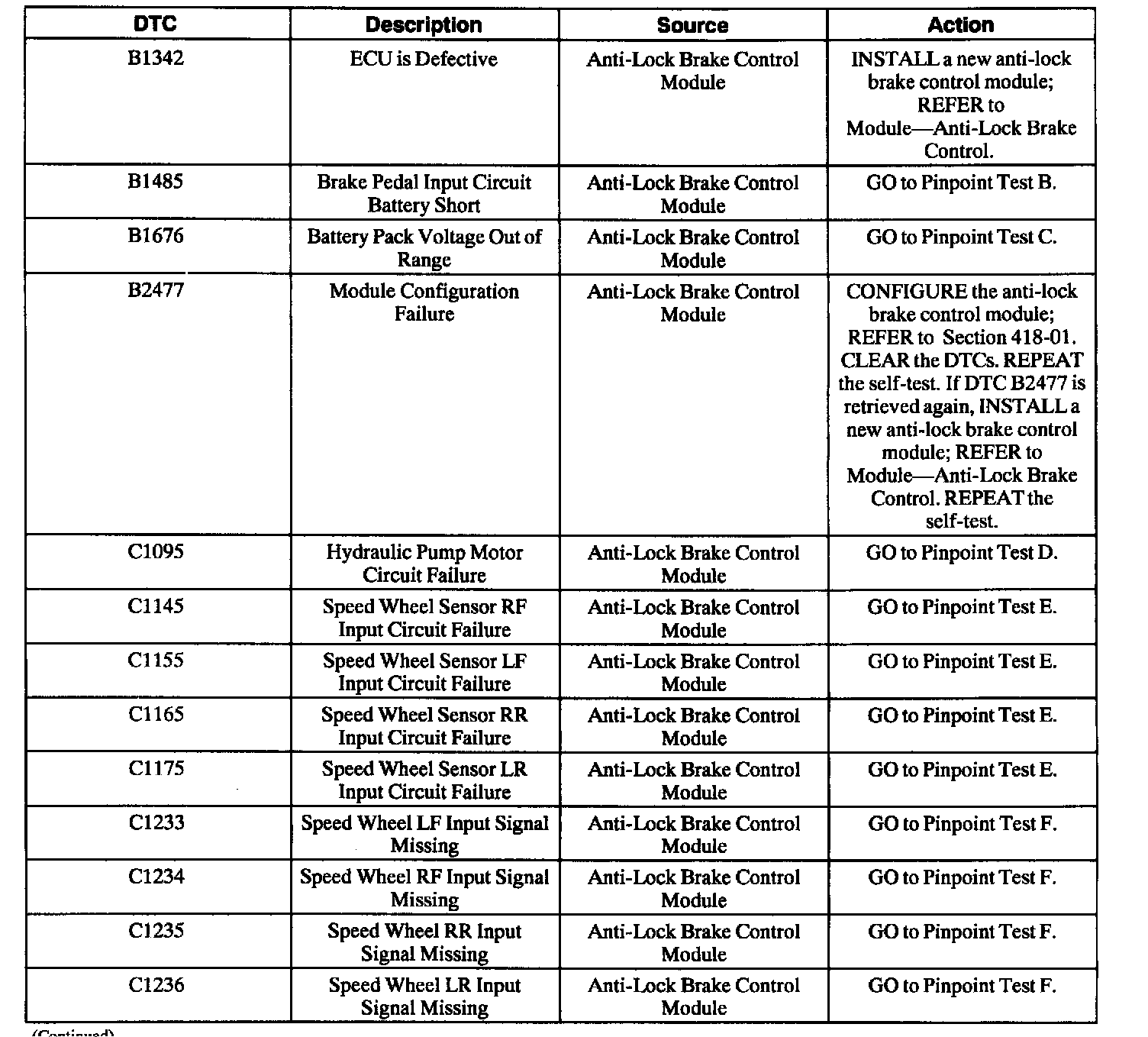 ABS Control Module Diagnostic Trouble Code (DTC) Index