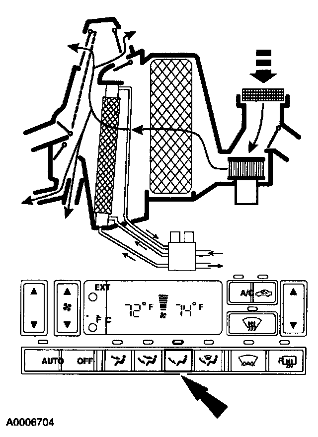 Outside air or recirculated air enters the vehicle. The air passes through the evaporator core and the heater core. Air is directed into the passenger compartment through the instrument panel ducts and registers and to the rear seat passengers through the center console ducts and registers.