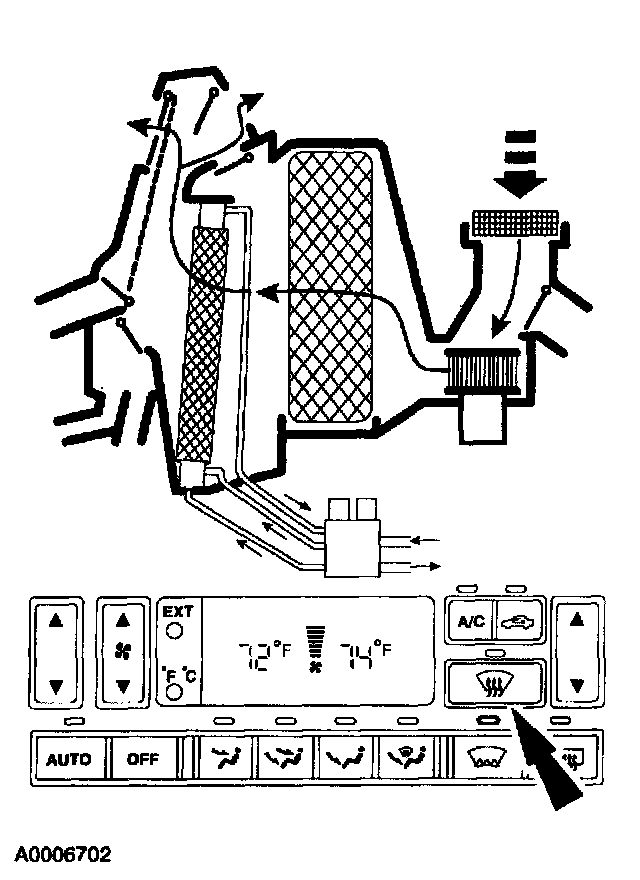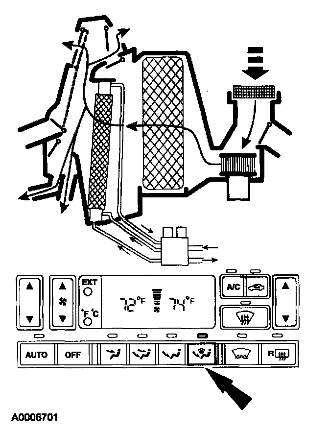 Outside air or recirculated air enters the vehicle. The air passes through the evaporator core and the heater core. Air is directed into the passenger compartment through the instrument panel ducts and registers and to the rear seat passengers through the center console ducts and registers and also through the rear floor ducts.