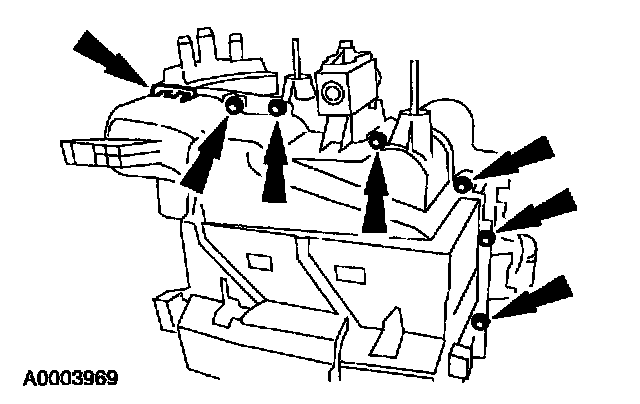 5. Remove the nine screws, disengage the clip and separate the heater/evaporator core housing.