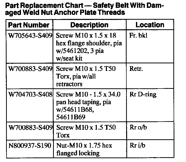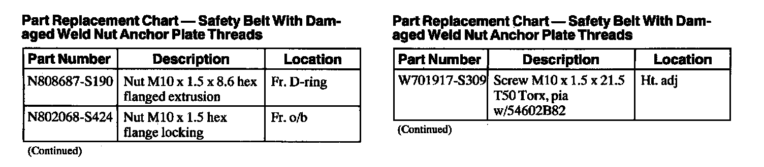 Part Replacement Chart - Safety Belt With Damaged Weld Nut Anchor Plate Threads, Part 2 Of 2: