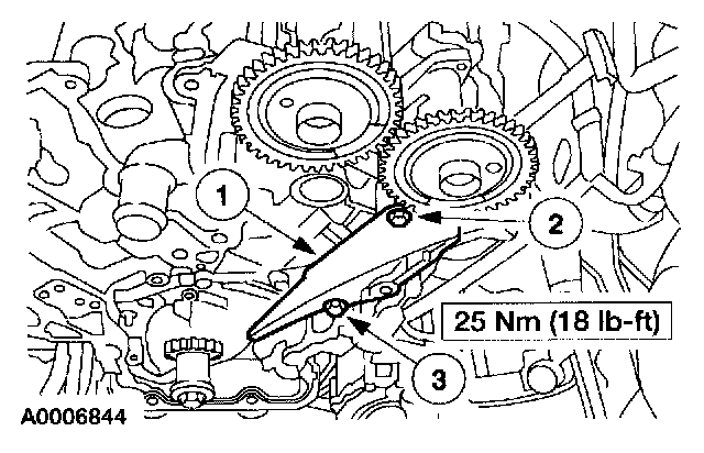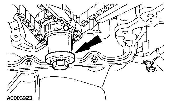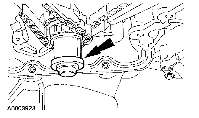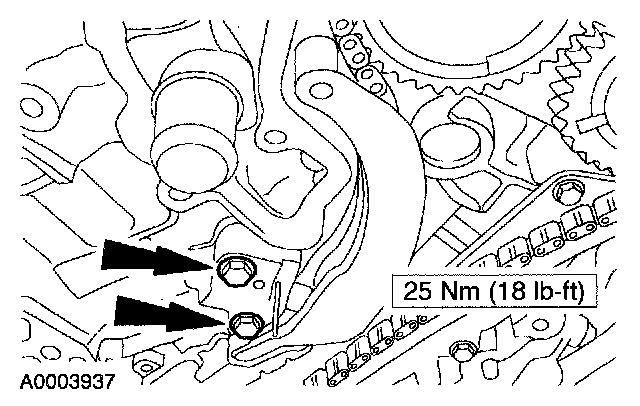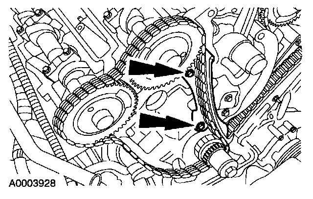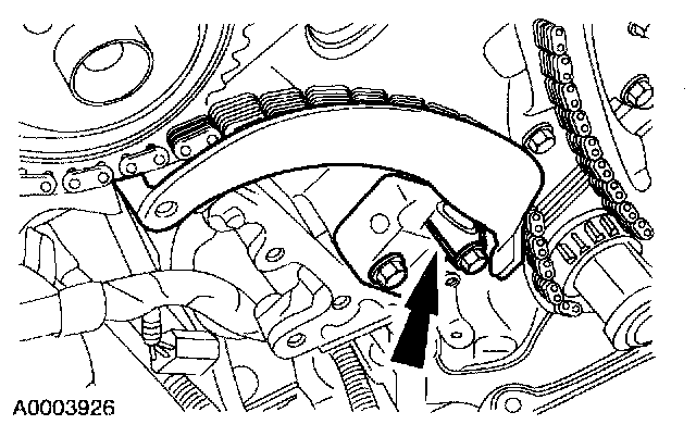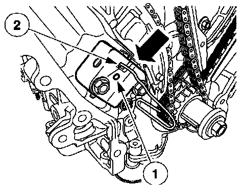 9. CAUTION:If the LH timing chain tensioner arm and the LH chain guide are to be reused, mark the position of each piece to make sure that they are installed on the correct side when reassembled.
