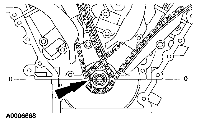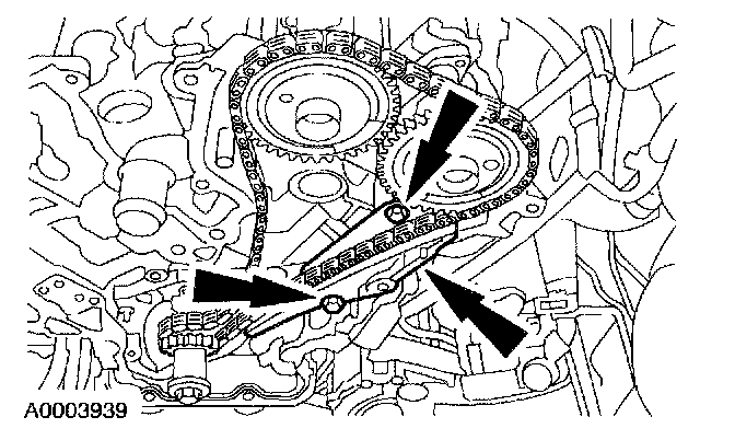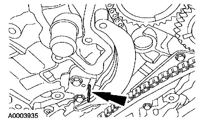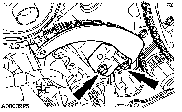5. CAUTION:If the RH timing chain tensioner arm and RH chain guide are to be reused, mark the position of each piece to make sure that they are installed on the correct side when reassembled.