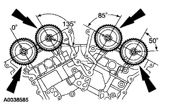 Verify that the timing index links (gold color) on the LH timing chain are in alignment with the timing index marks on the camshaft and crankshaft sprockets.