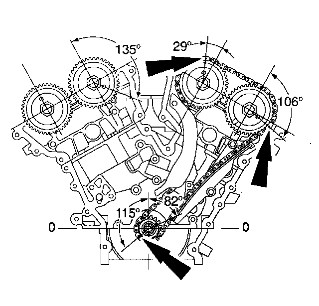 Verify that the timing index links (gold color) on the RH timing chain are in alignment with the timing index marks on the camshaft and crankshaft sprockets.