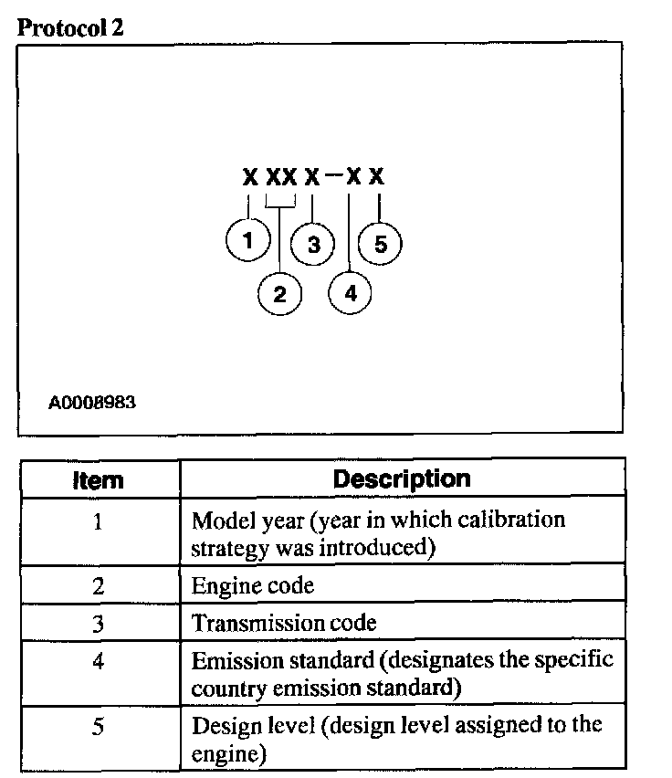 Powertrain calibration information is printed in the lower right corner of the Vehicle Certification (VC) Label. Only the base calibration information is printed. Revision levels will not appear, however, they can be found in On Line Automotive Service Information System (OASIS). For the current model year, Ford Motor Company is using three different protocols which describe powertrain base calibration. These protocols are designed to provide worldwide standardization for vehicle calibration. If the electronic calibration strategy has been used since 1998 and carried into the current model year, Protocol 1 will be used. Refer to Protocol 1. If the electronic calibration strategy was introduced in 1999 and carried into the current model year. Protocol 2 will be used. Refer to Protocol 2. For electronic calibration introduced in 2000 through the current model year, Protocol 3 is used. Refer to Protocol 3.