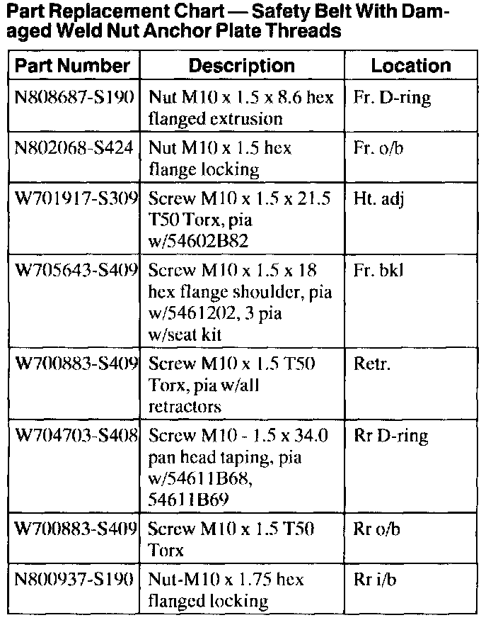 Part Replacement Chart - Safety Belt With Damaged Weld Nut Anchor Plate Threads: