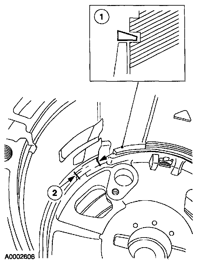 Measure the distance from the top of the gauge bar to the drum bearing surface through the hole in the disc and record as dimension B. Repeat measurement 180 degrees opposite side of the special tool and record as dimension C.
