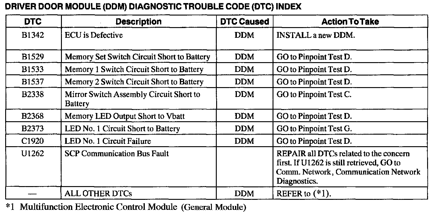 Driver Door Module (DDM) Diagnostic Trouble Code (DTC) Index