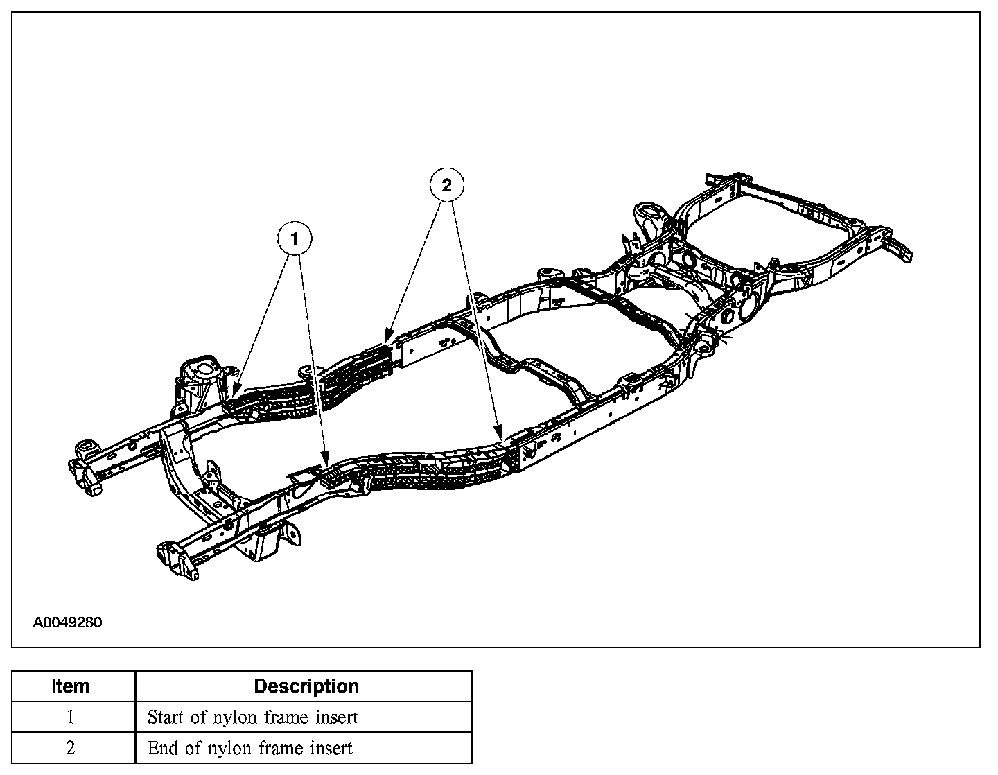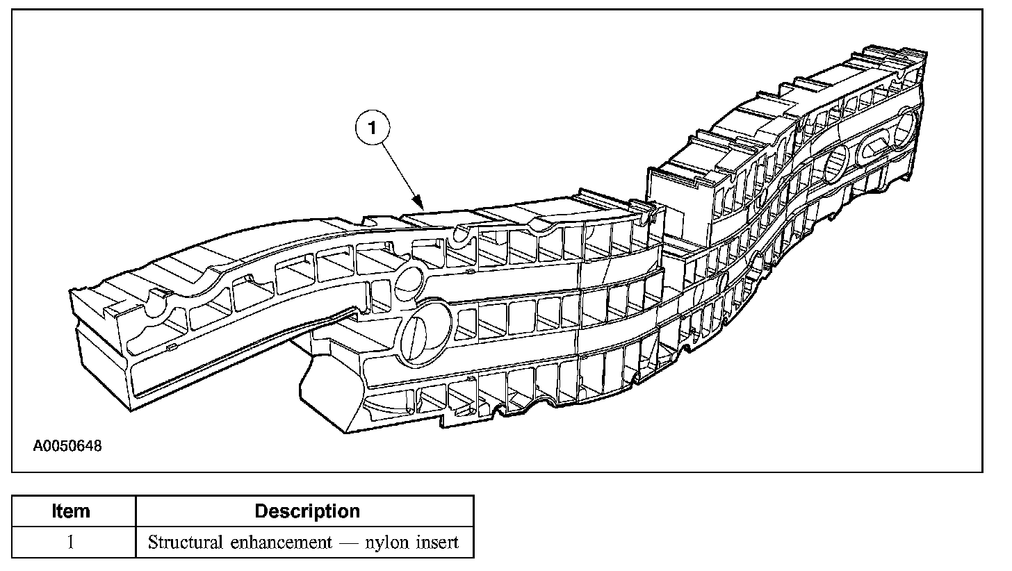 The purpose of this insert is to enhance the structural rigidity of the frame in this area. This insert is secured in position with a structural foam. In the event of a collision which requires frame repair in the area of this nylon insert, the following repair procedure should be followed if the nylon insert has broken loose from the frame and a rattle is detected.
