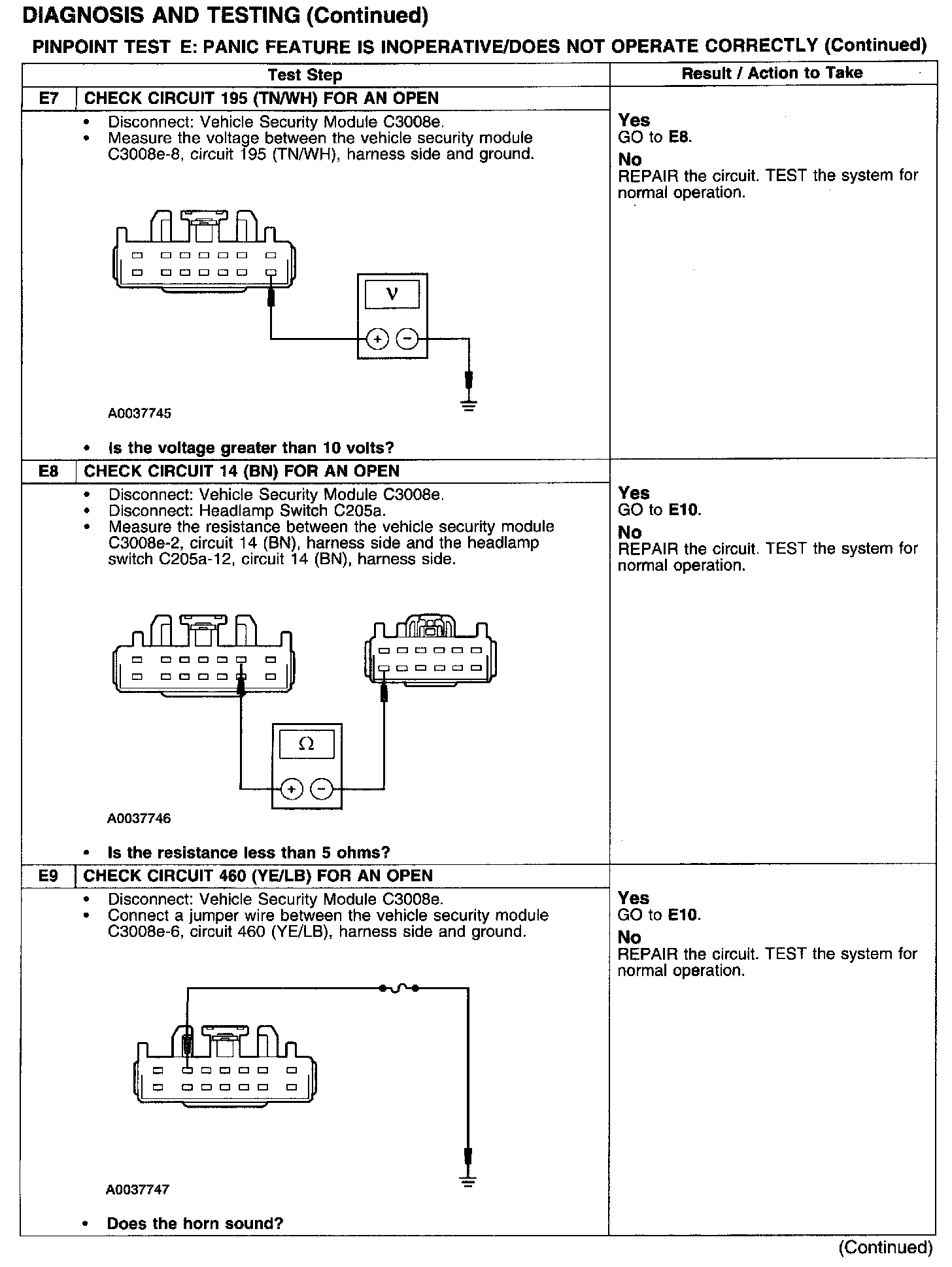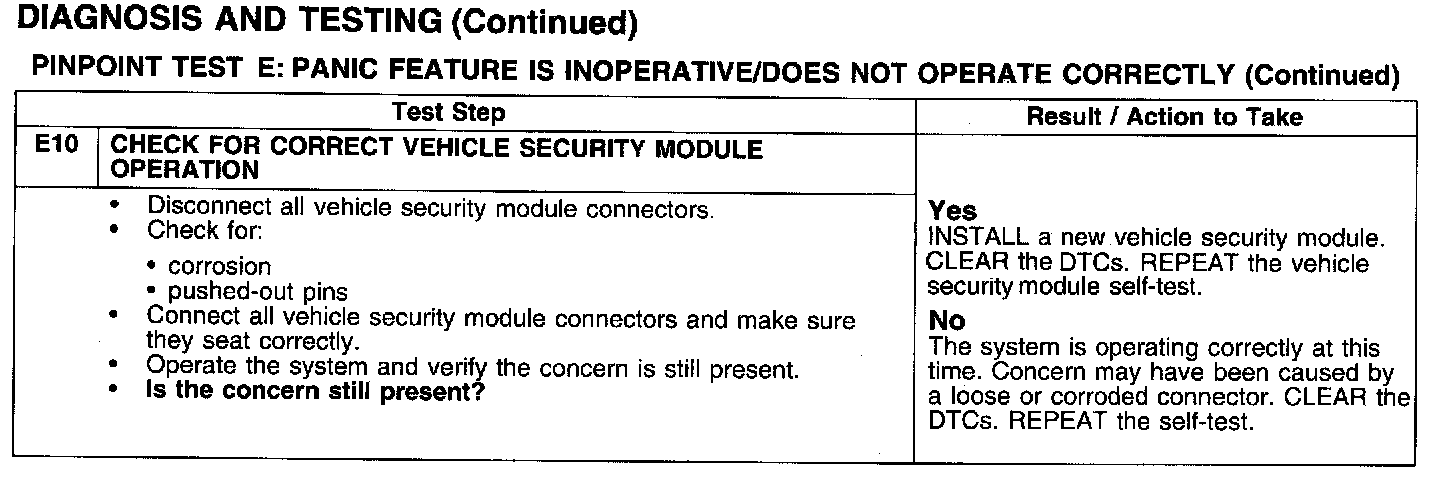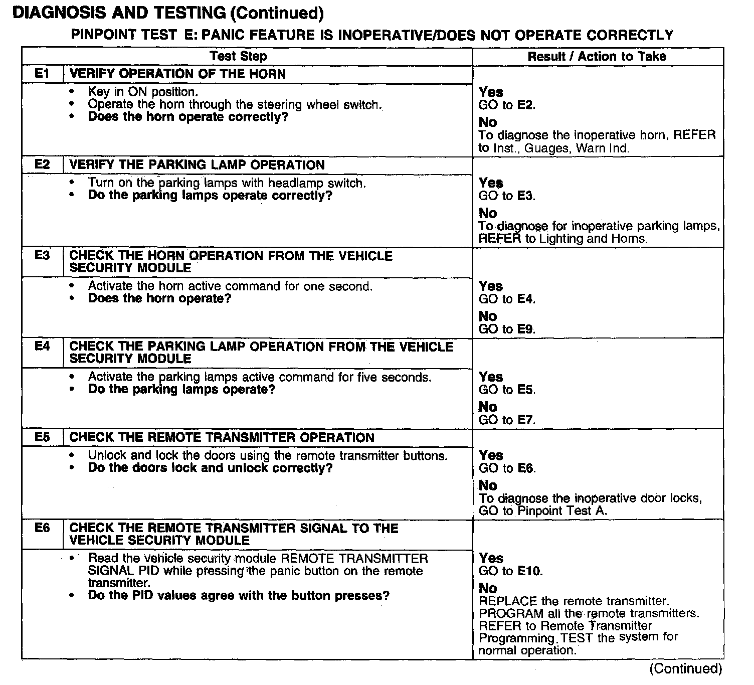PINPOINT TEST E: PANIC FEATURE IS INOPERATIVE/DOES NOT OPERATE CORRECTLYTest E1-E6: