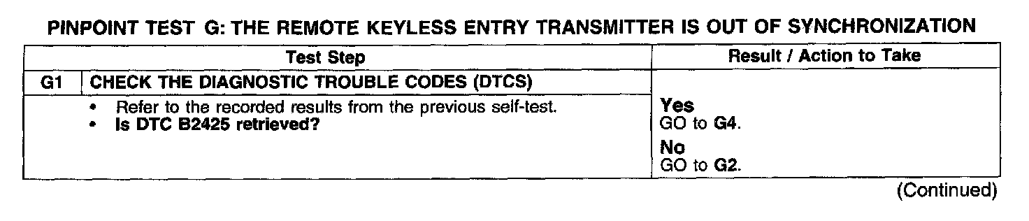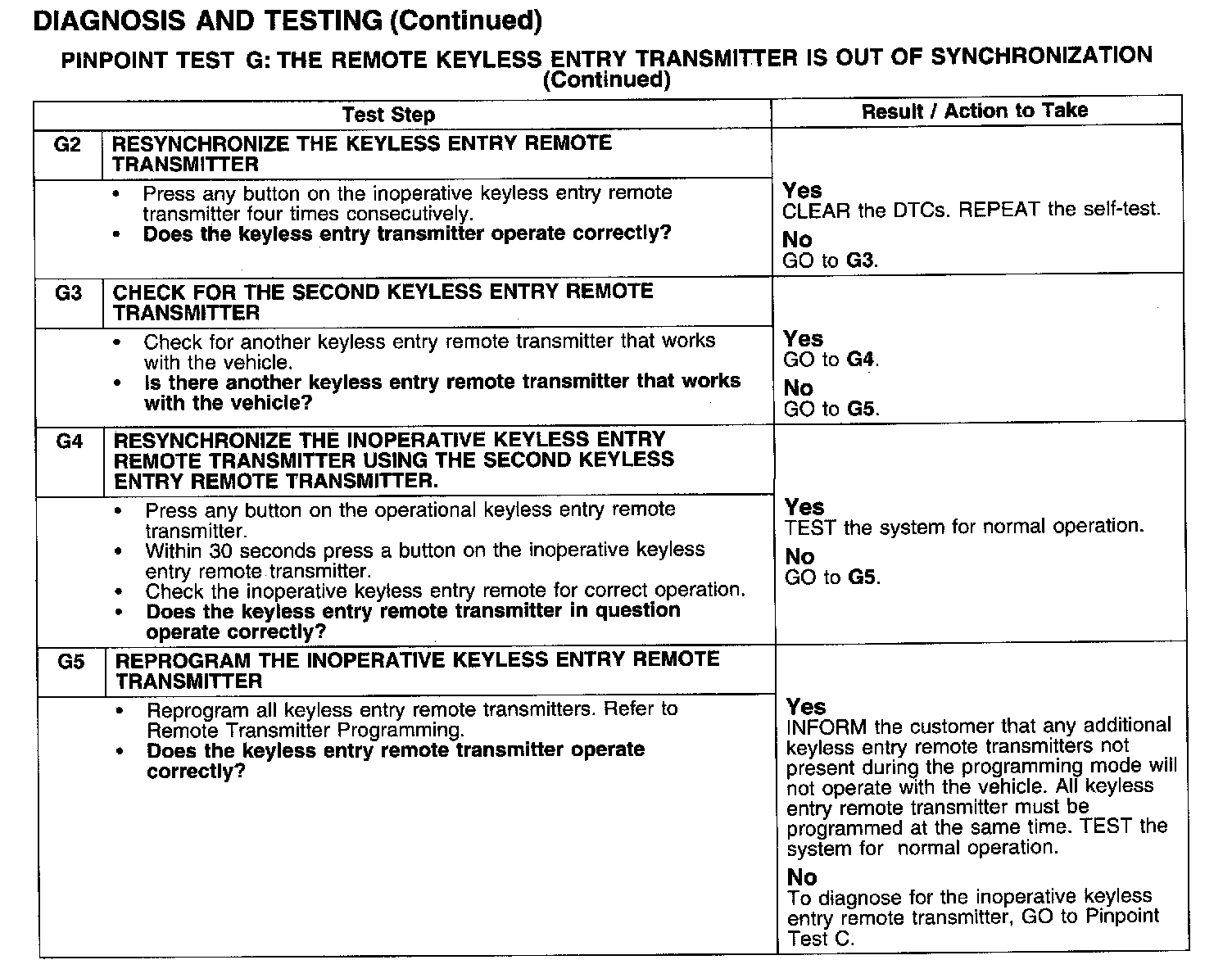 PINPOINT TEST G: REMOTE KEYLESS ENTRY TRANSMITTER IS OUT OF SYNCHRONIZATIONTest G1: