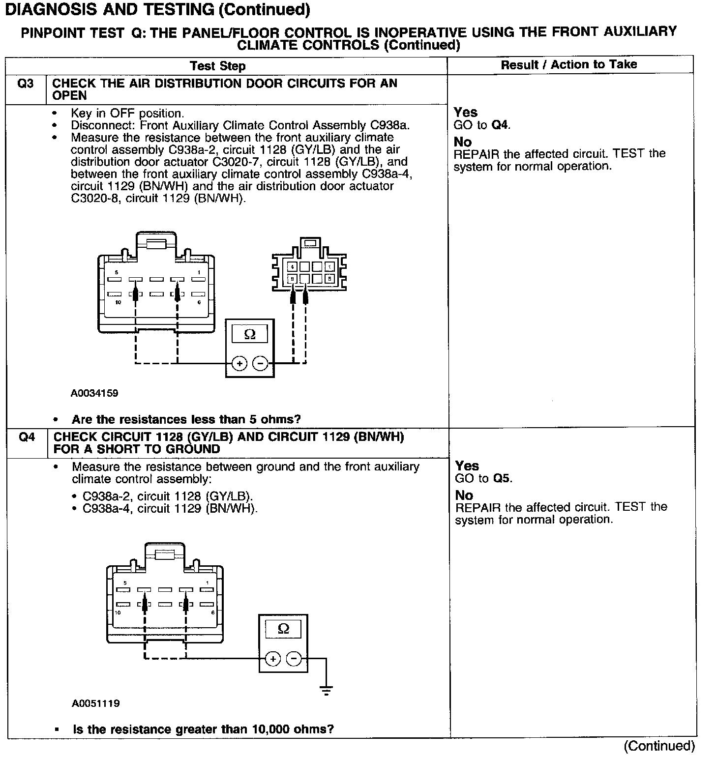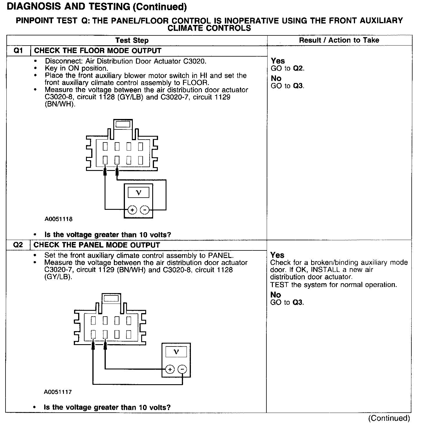 PINPOINT TEST Q: THE PANEL/FLOOR CONTROL IS INOPERATIVE USING THE FRONT AUXILIARY CLIMATE CONTROLSTest Q1-Q2: