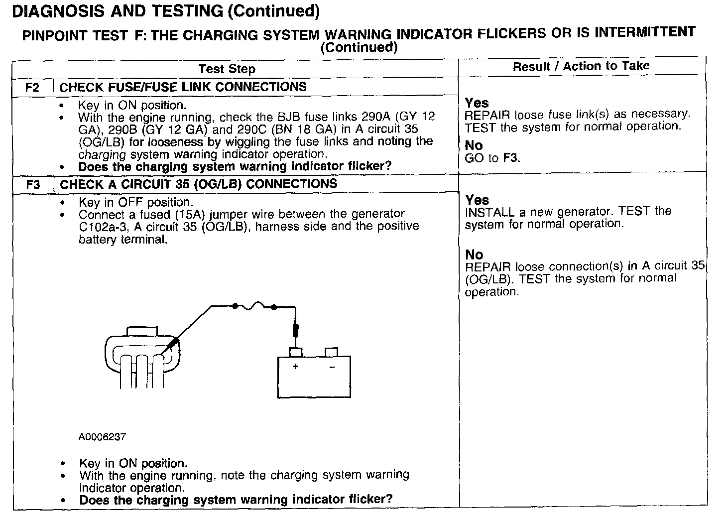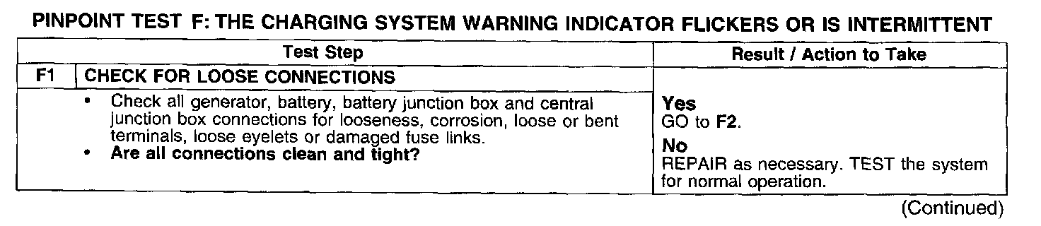 PINPOINT TEST F: THE CHARGING SYSTEM WARNING INDICATOR FLICKERS OR IS INTERMITTENTTest F1: