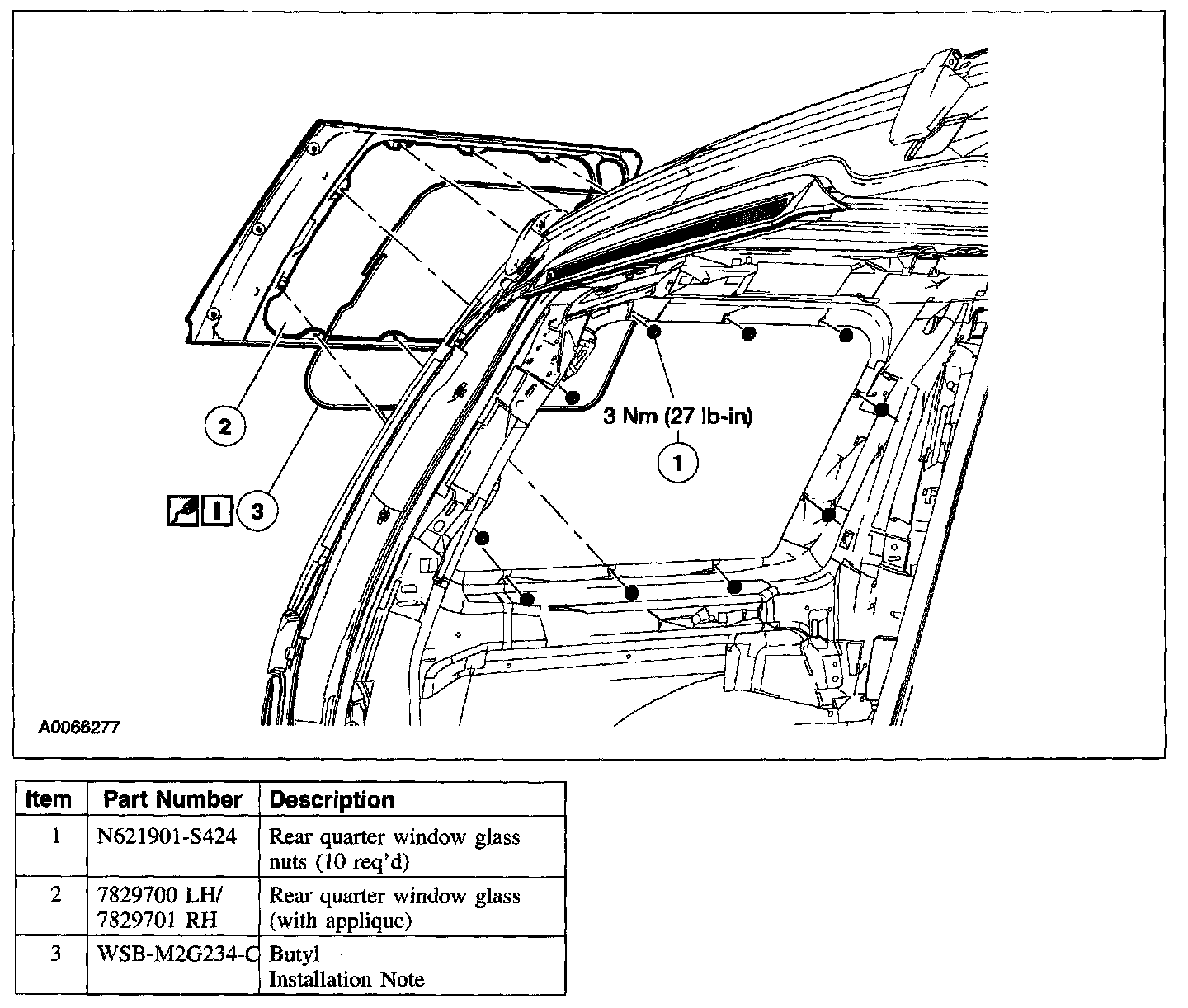 Apply 6 mm (0.24 in) sealant or equivalent meeting Ford specification WSB-M2G234-C to the rear quarter window glass frame.