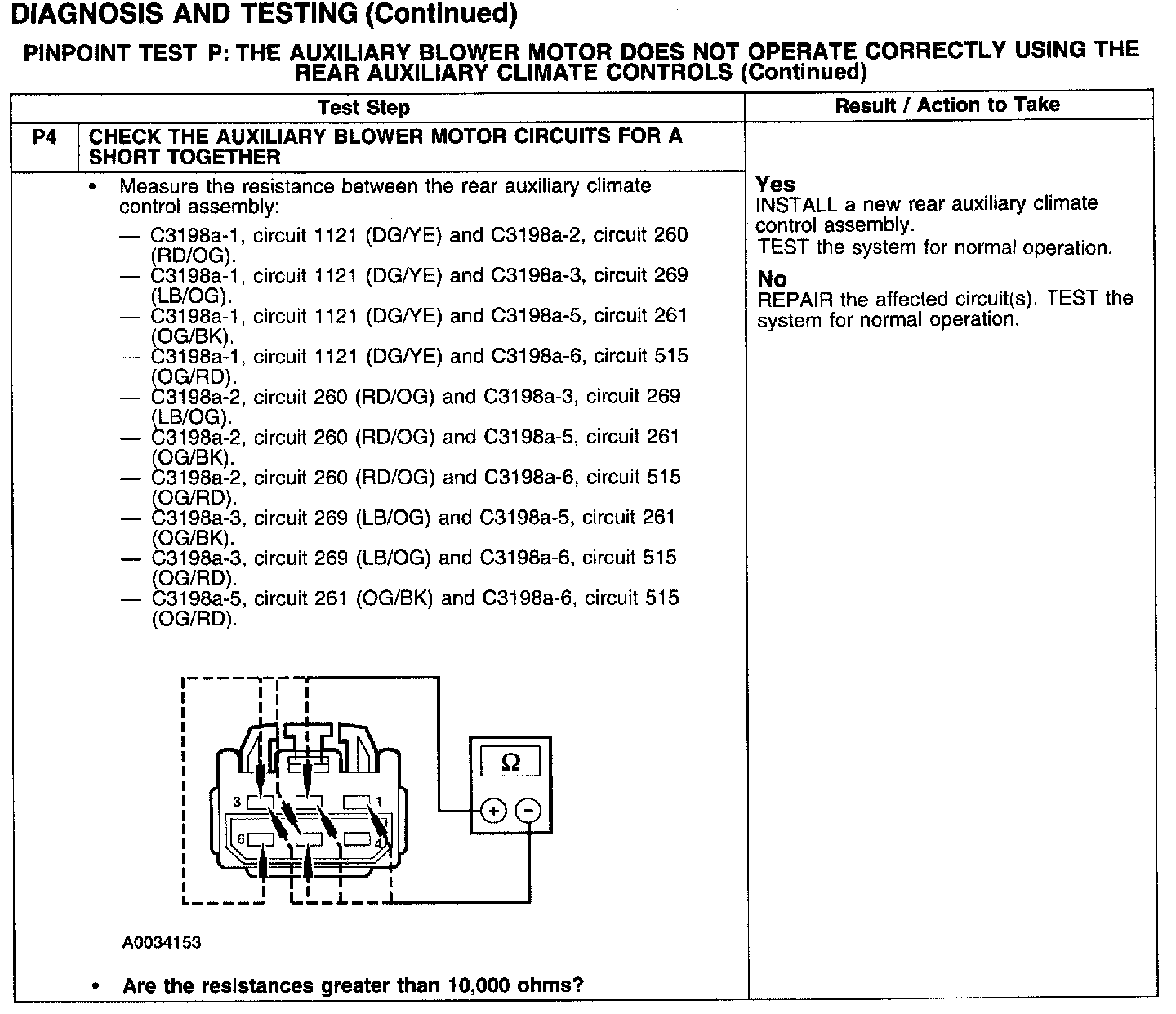 PINPOINT TEST P: THE AUXILIARY BLOWER MOTOR DOES NOT OPERATE CORRECTLY USING THE REAR AUXILIARY CLIMATE CONTROLSTest P1-P2: