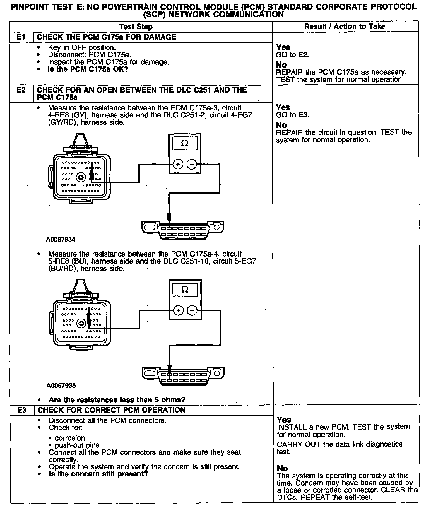PINPOINT TEST E: NO POWERTRAIN CONTROL MODULE (PCM) STANDARD CORPORATE PROTOCOL (SCP) NETWORK COMMUNICATIONTest E1-E3: