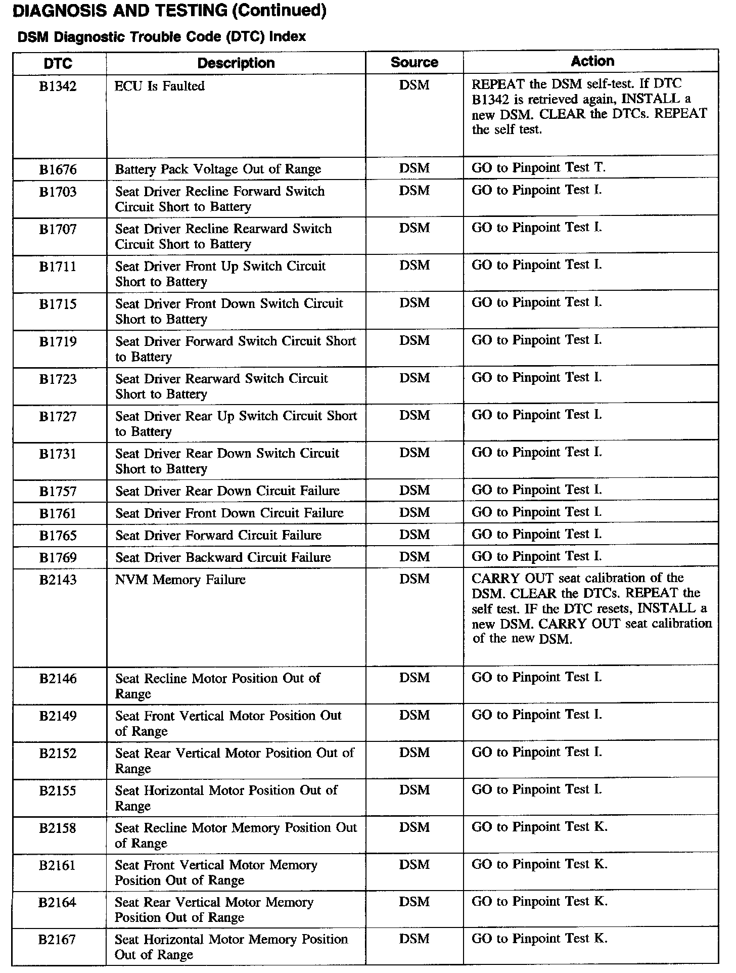 Driver Seat Module Diagnostic Trouble Code (DTC) Index