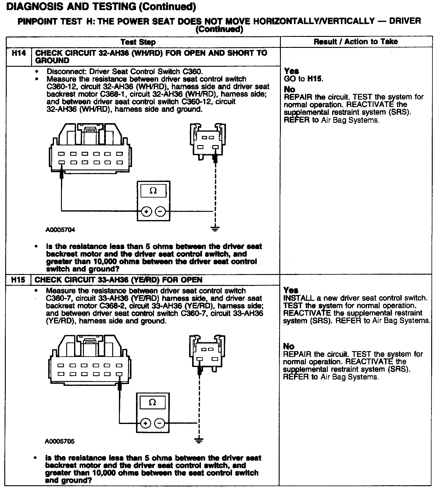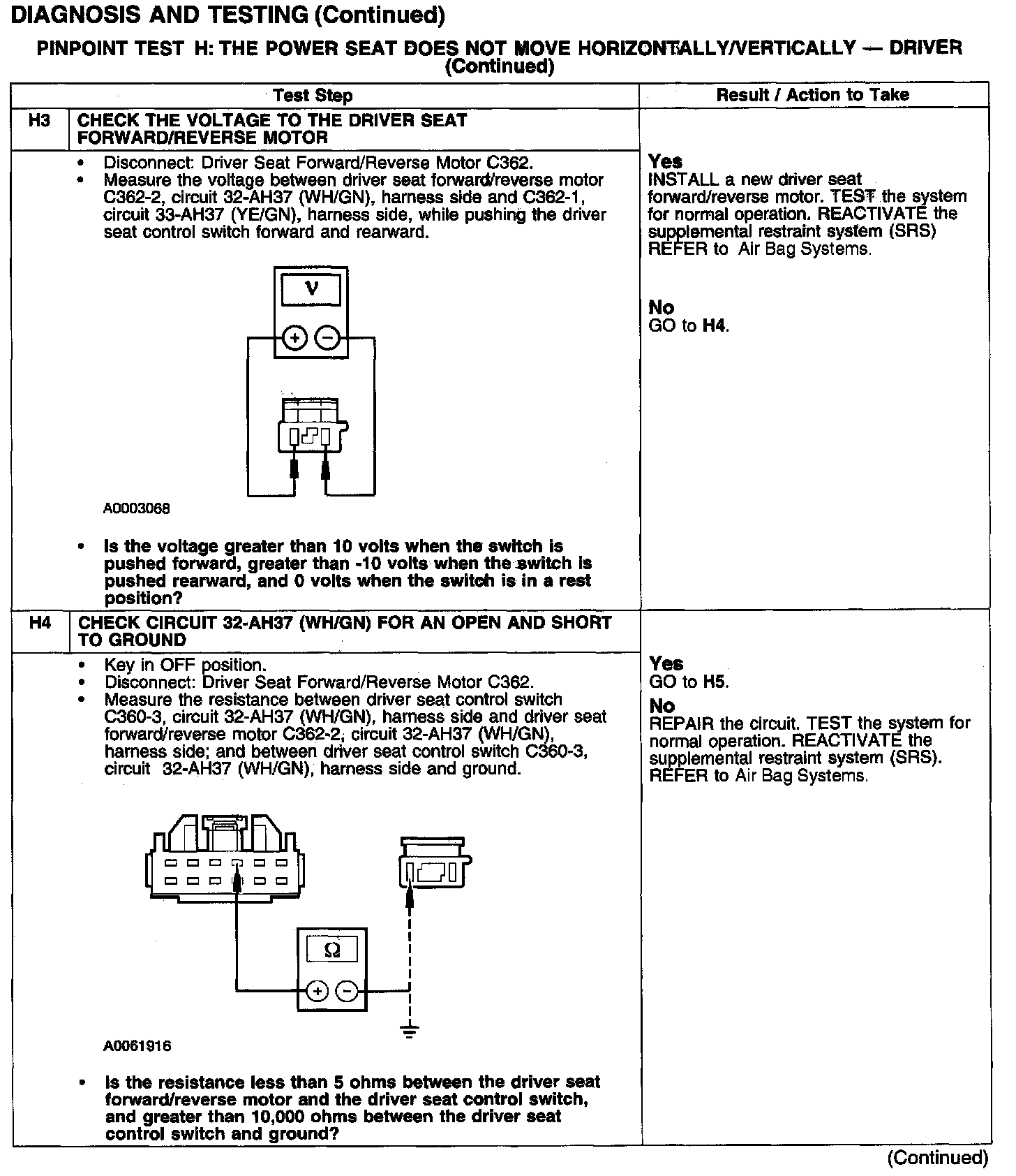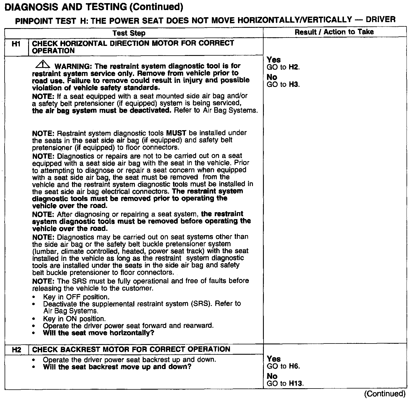 PINPOINT TEST H: THE POWER SEAT DOES NOT MOVE HORIZONTALLY/VERTICALLY DRIVERTest H1-H2: