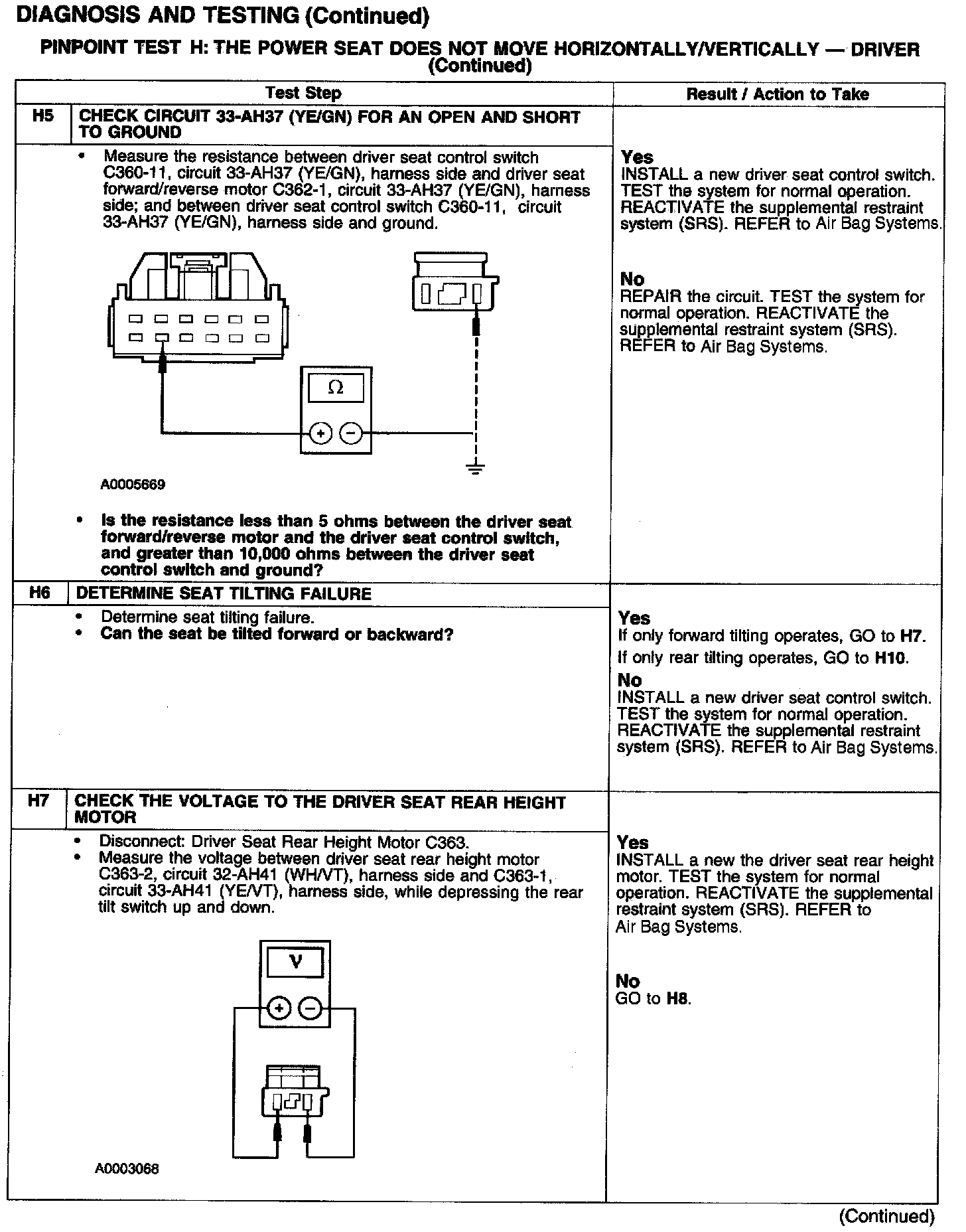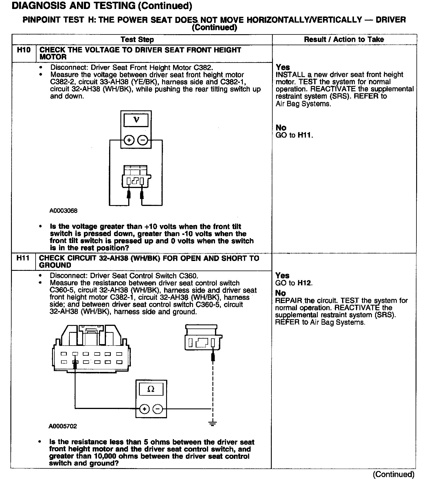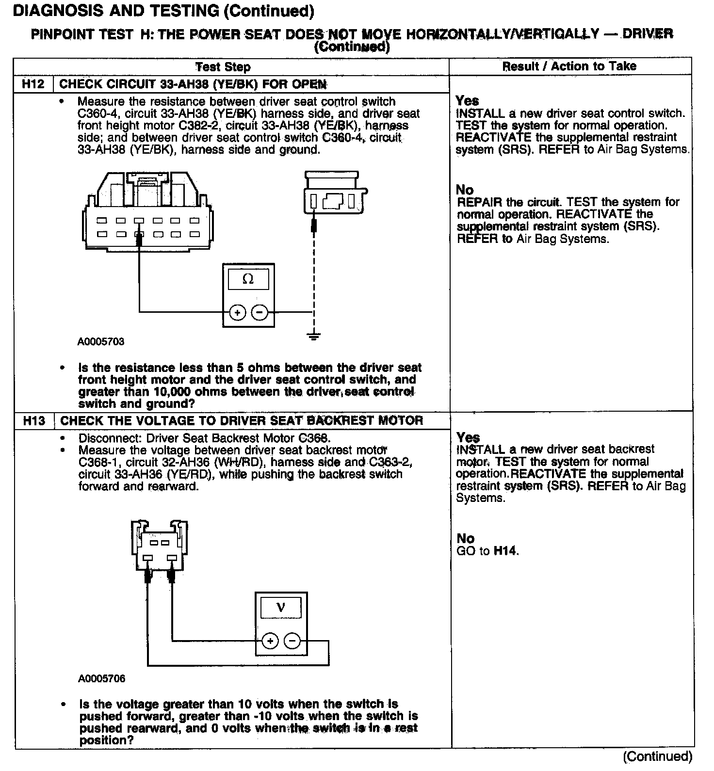 PINPOINT TEST H: THE POWER SEAT DOES NOT MOVE HORIZONTALLY/VERTICALLY DRIVERTest H1-H2: