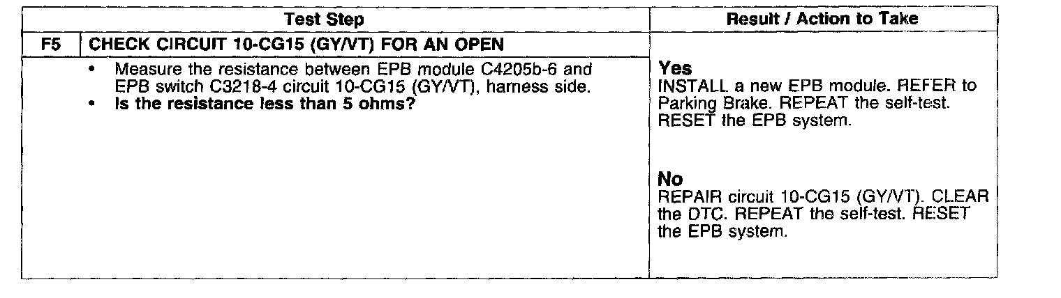 The electronic parking brake (EPB) switch circuits 8-CG15 (WH/BU) and 10-CGI5 (GY/VT) receive a reference voltage from the EPB module when the switch is in its neutral position. This voltage is between 3.5 and 4.5 volts. When the switch contacts close on the apply or release side, a resistor inside the switch is shorted, causing a voltage on switch circuits 8-CG15 (WH/BU) or 10-CG15 (GY/VT) to change from 1.5-3.0 volts. When the EPB module receives this voltage range on the apply or release circuit, an output signal is generated to the actuator to apply or release the EPB.