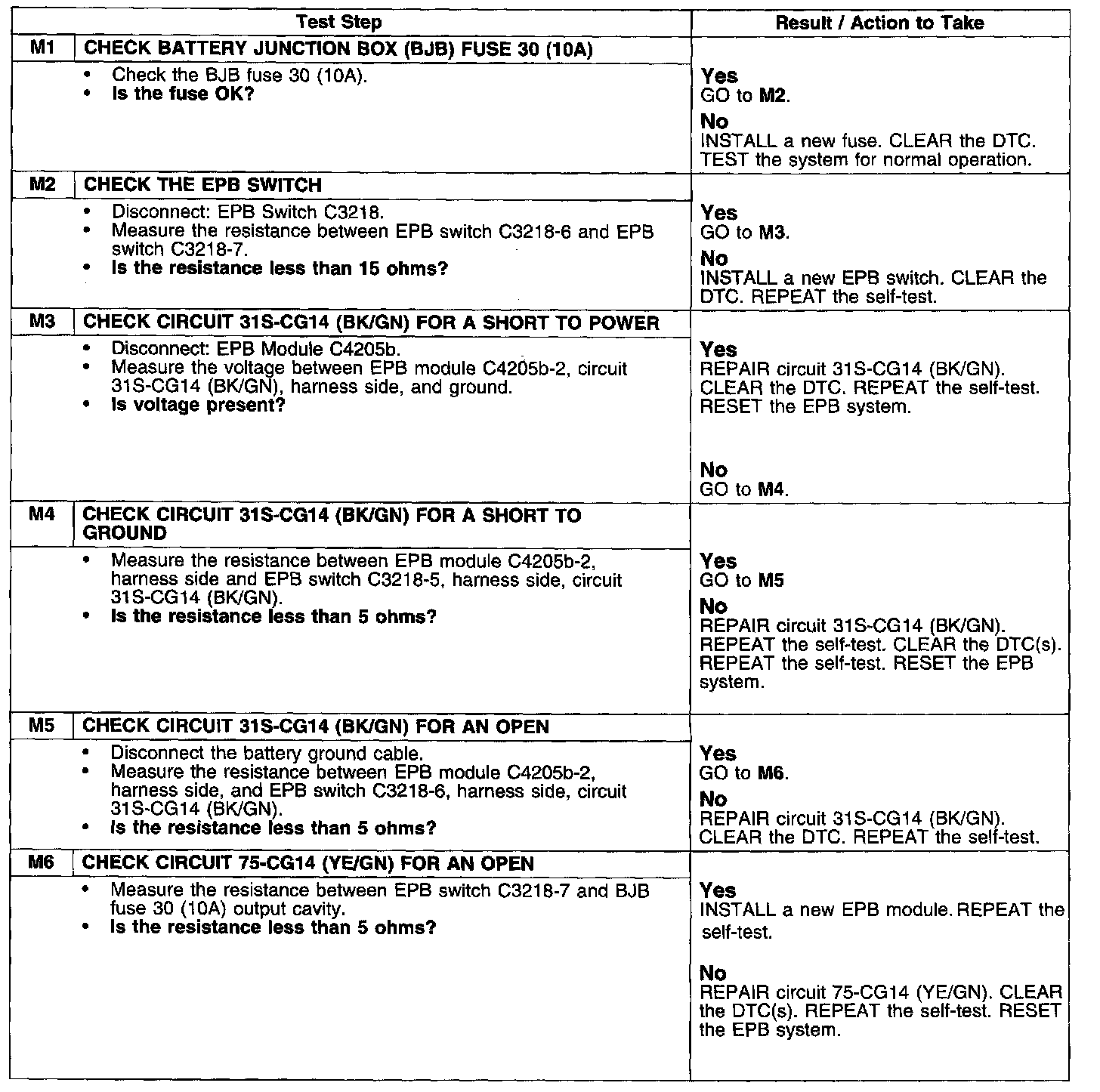 Pinpoint Test M: DTCS C1987/C1988: Yellow EPB Fault Warning Indicator Short To Battery/Circuit Failure