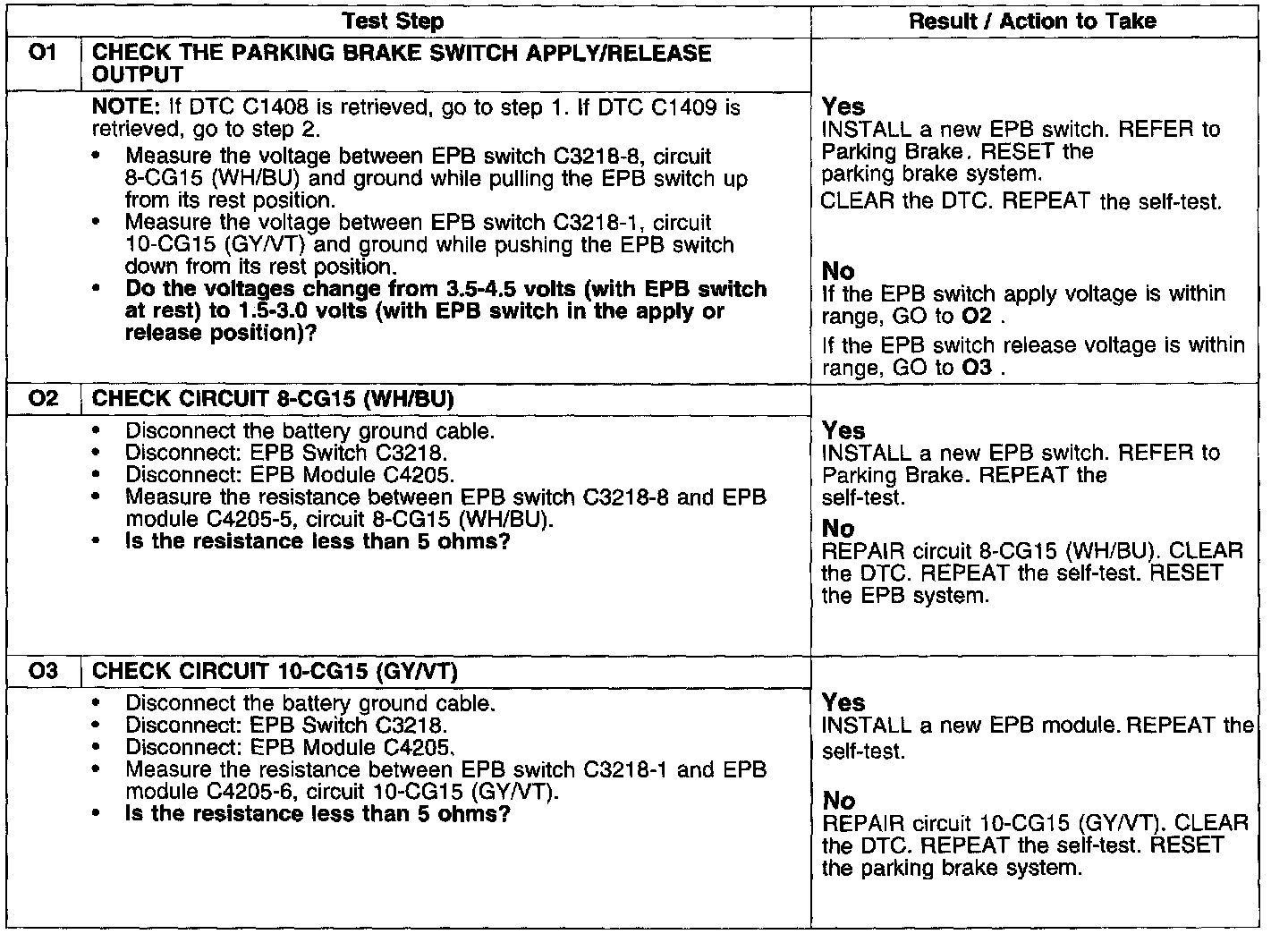The electronic parking brake (EPB) switch circuits 8-CG15 (WH/BU) and 10-CG15 (GY/VT) receive a reference voltage from the EPB module when the switch is in its neutral position. This voltage is between 3.5 and 4.5 volts. When the switch contacts close on the apply or release side, a resistor inside the switch is shorted, causing the voltage on circuits 8-CG15 (WH/BU) or 10 CG15 (GY/VT) to change from 1.5 to 3.0 volts. When the EPB module receives this voltage range on the apply or release circuit, an output signal is generated to the actuator to apply or release the EPB.