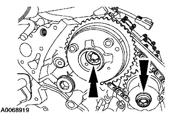 6. CAUTION: The exhaust camshaft sprocket bolt must be fully tightened before tightening the intake camshaft sprocket bolt.
