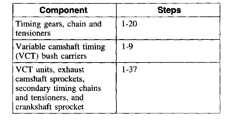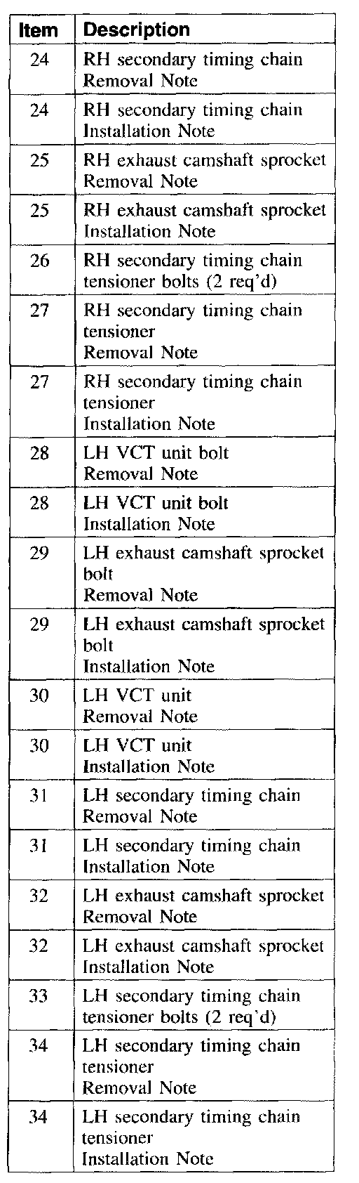 Items 28-32, and 34: LH Variable Camshaft Timing (VCT) Unit, Exhaust Camshaft Sprocket and Secondary Timing Chain Removal Note