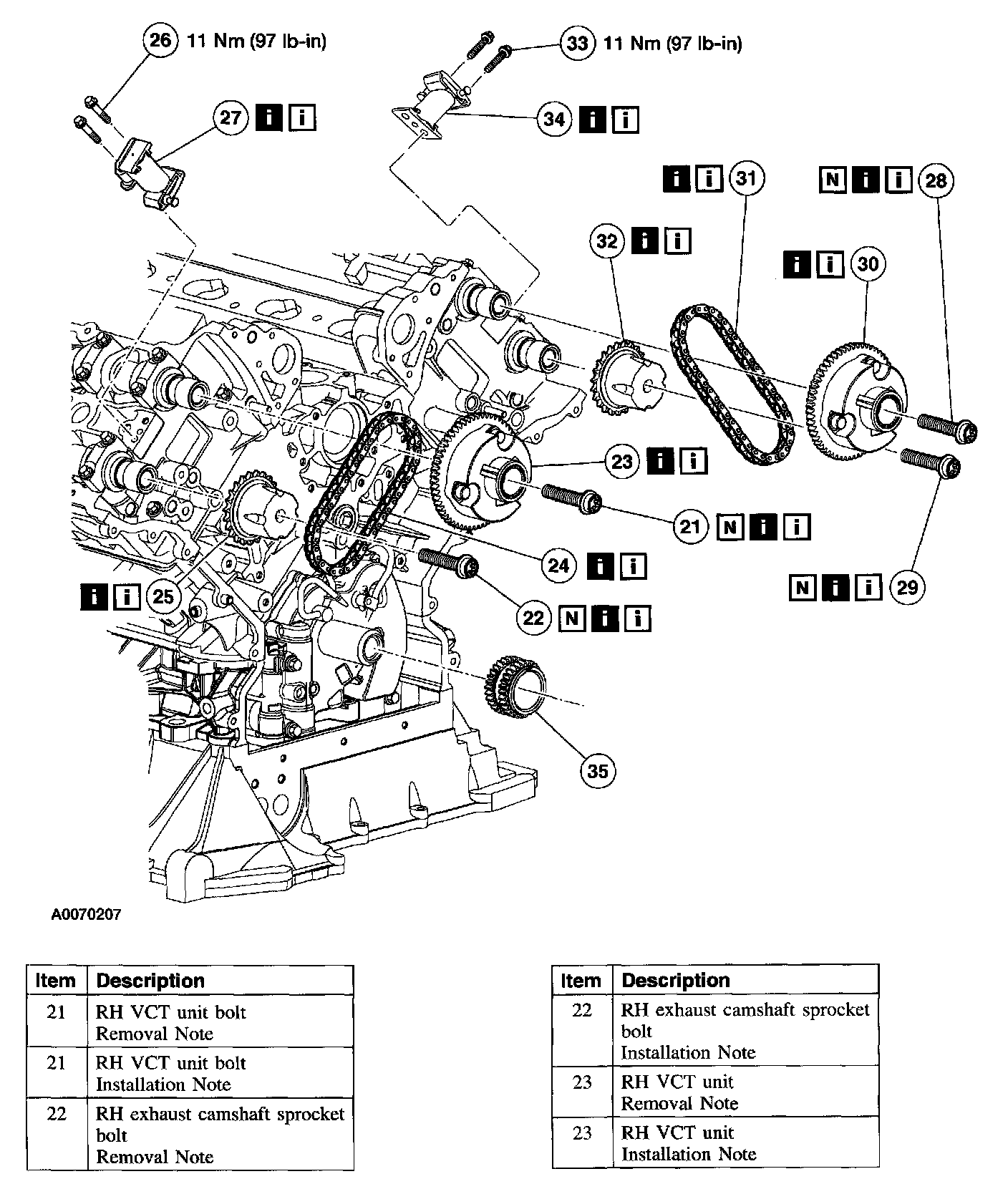 Items 21-25, and 27: RH Variable Camshaft Timing (VCT) Unit, Exhaust Camshaft Sprocket and Secondary Timing Chain Removal Note