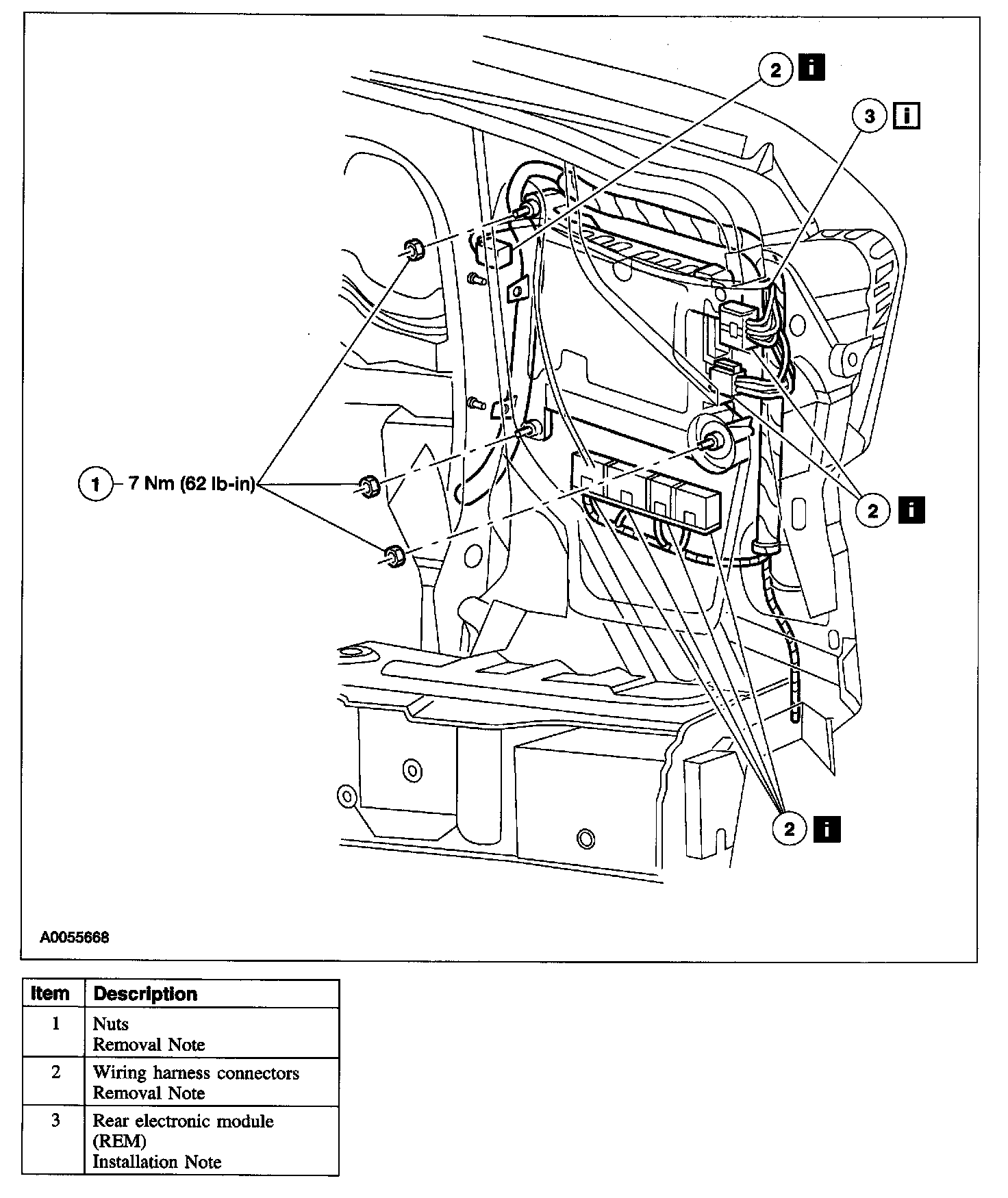 Item 2: Rear Electronic Module (REM) Wiring Harness Connector Removal Note