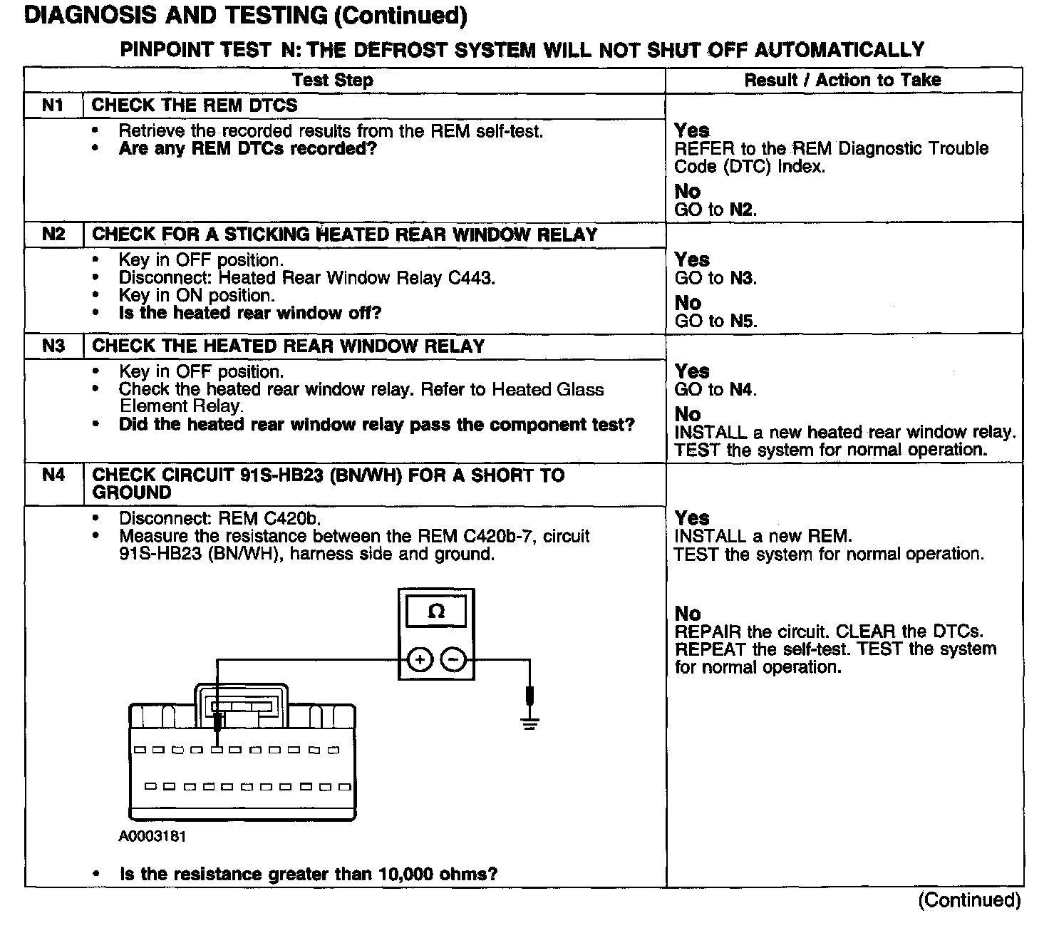 The heated rear window relay coil stays grounded by the rear electronic module (REM) for approximately ten minutes, after which the REM will remove the ground to circuit 91S-HB23 (BN/WH), thereby opening the heated rear window relay. This will disconnect the power from circuits 15S-DA13 (GN/YE) / 15S-HB19 (GN/BU), which power the heated rear window.