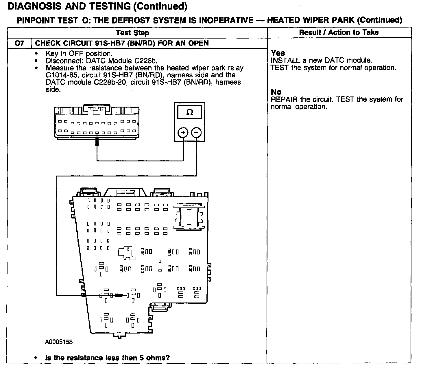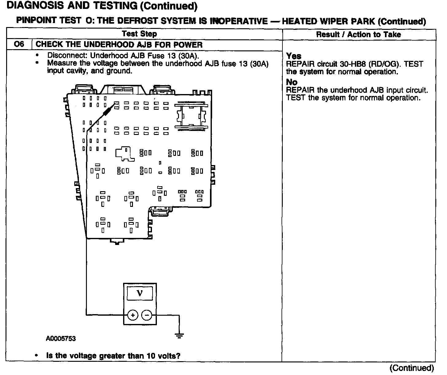 The heated wiper park relay is powered by the auxiliary junction box (AJB) fuse 13 (30A) through circuits 30-HB8 (RD/OG) and 30-HB8A (RD/OG). when the ambient temperature falls below 3°C (38°F), the dual automatic temperature control (DATC) module will ground circuit 91S-HB7 (BN/RD), closing the heated wiper park relay. This will allow power to flow through circuit 30S-HB42 (RD/YE) to the heated wiper park grids in the windshield.