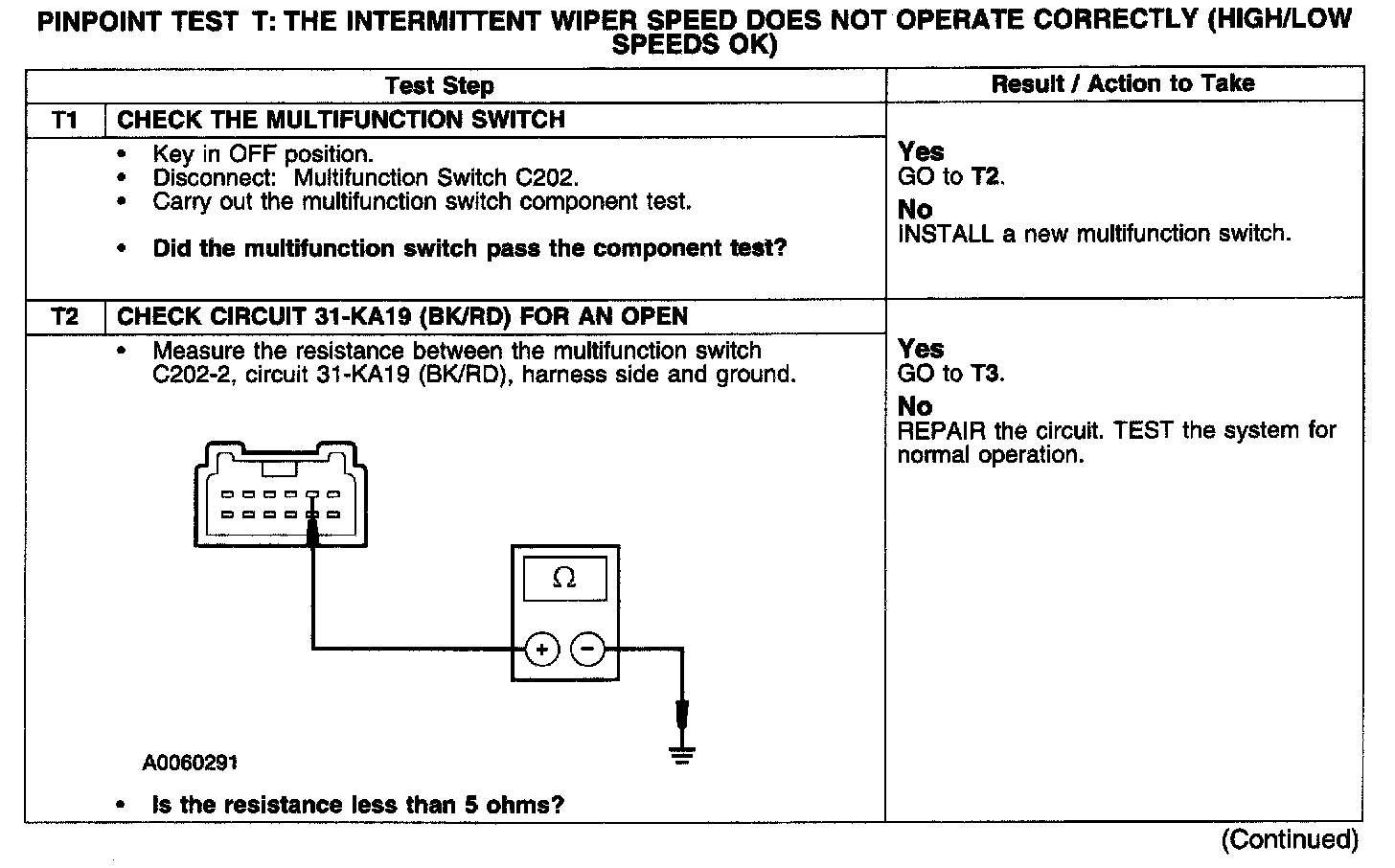 PINPOINT TEST T: THE INTERMITTENT WIPER SPEED DOES NOT OPERATE CORRECTLY (HIGH/LOW SPEEDS OK)Test T1-T2: