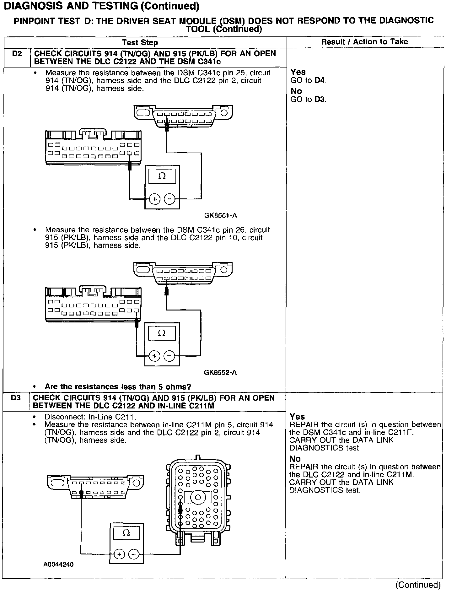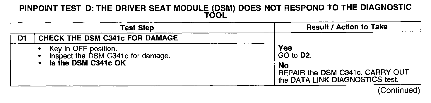 PINPOINT TEST D: THE DRIVER SEAT MODULE (DSM) DOES NOT RESPOND TO THE DIAGNOSTIC TOOL