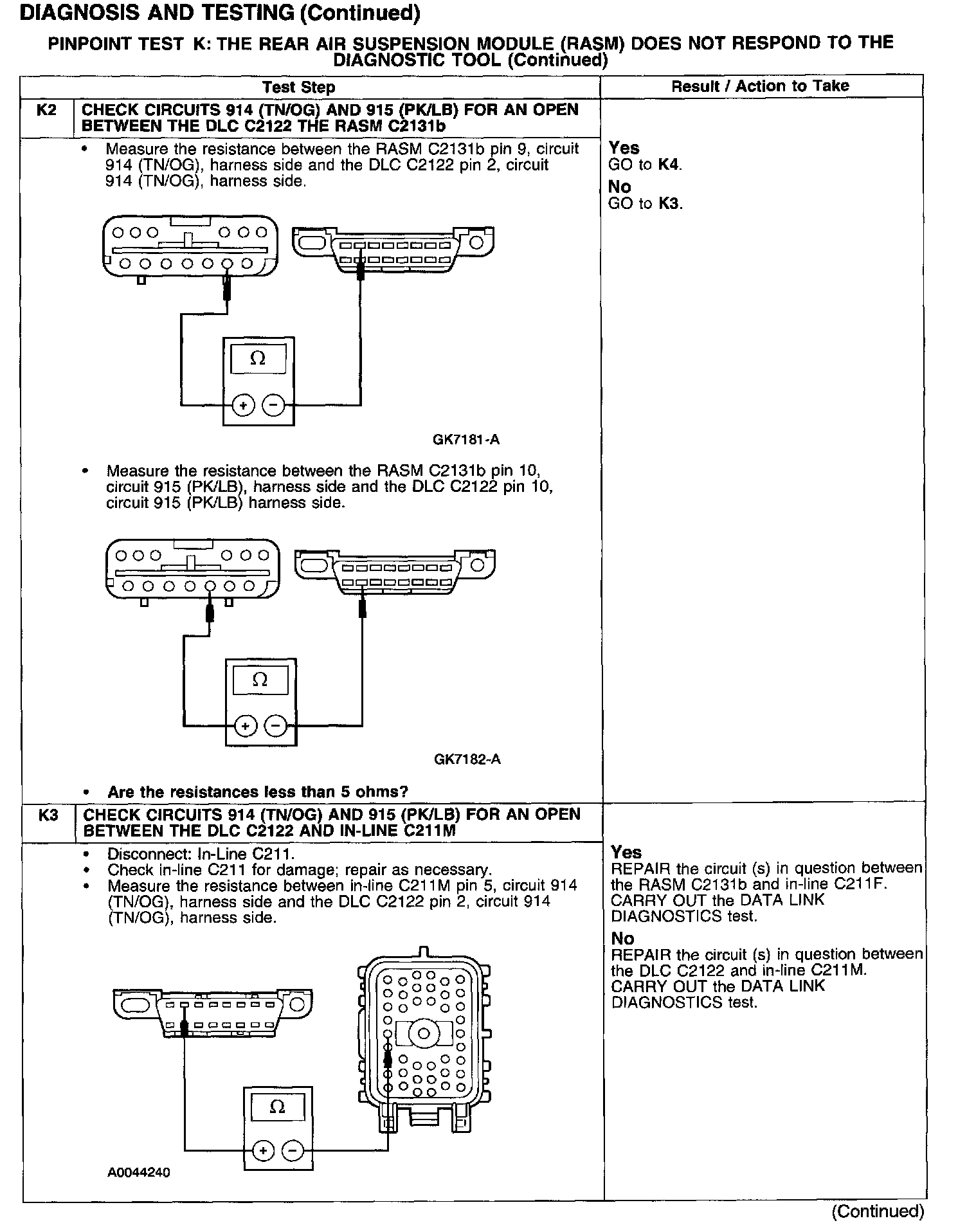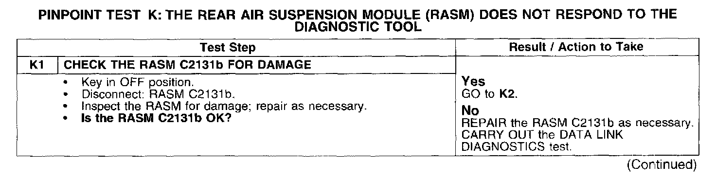 PINPOINT TEST K: THE REAR AIR SUSPENSION MODULE (RASM) DOES NOT RESPOND TO THE DIAGNOSTIC TOOL