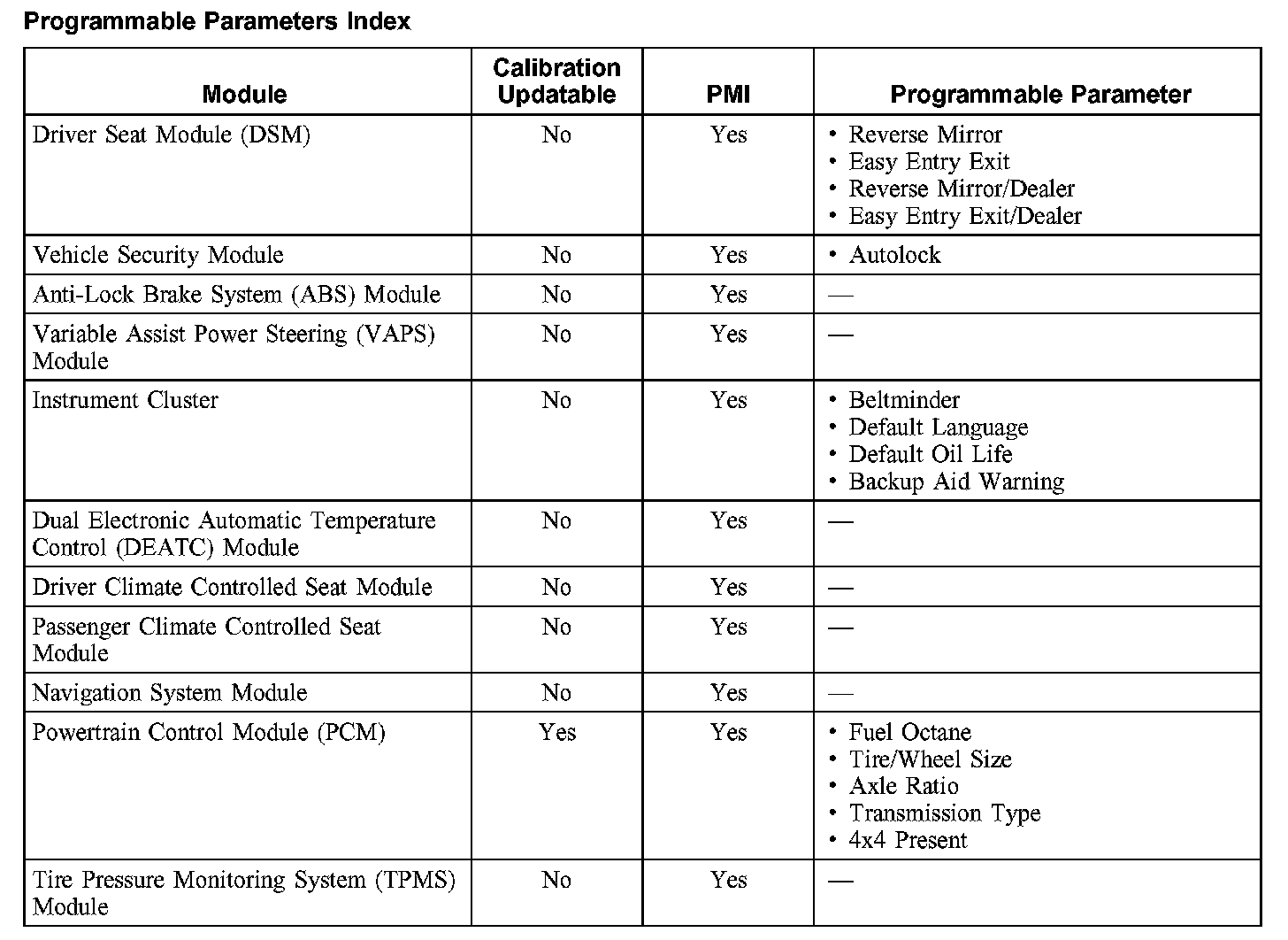 Programmable Parameters Index: