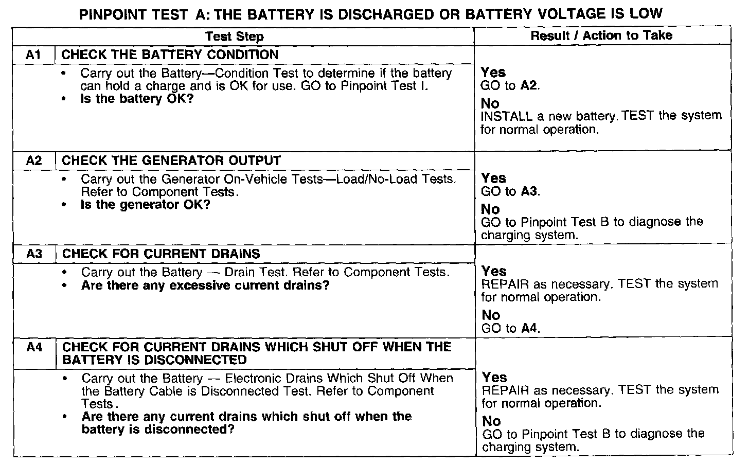 PINPOINT TEST A: THE BATTERY IS DISCHARGED OR BATTERY VOLTAGE IS LOWTest A1-A4: