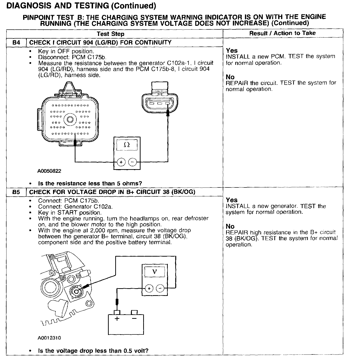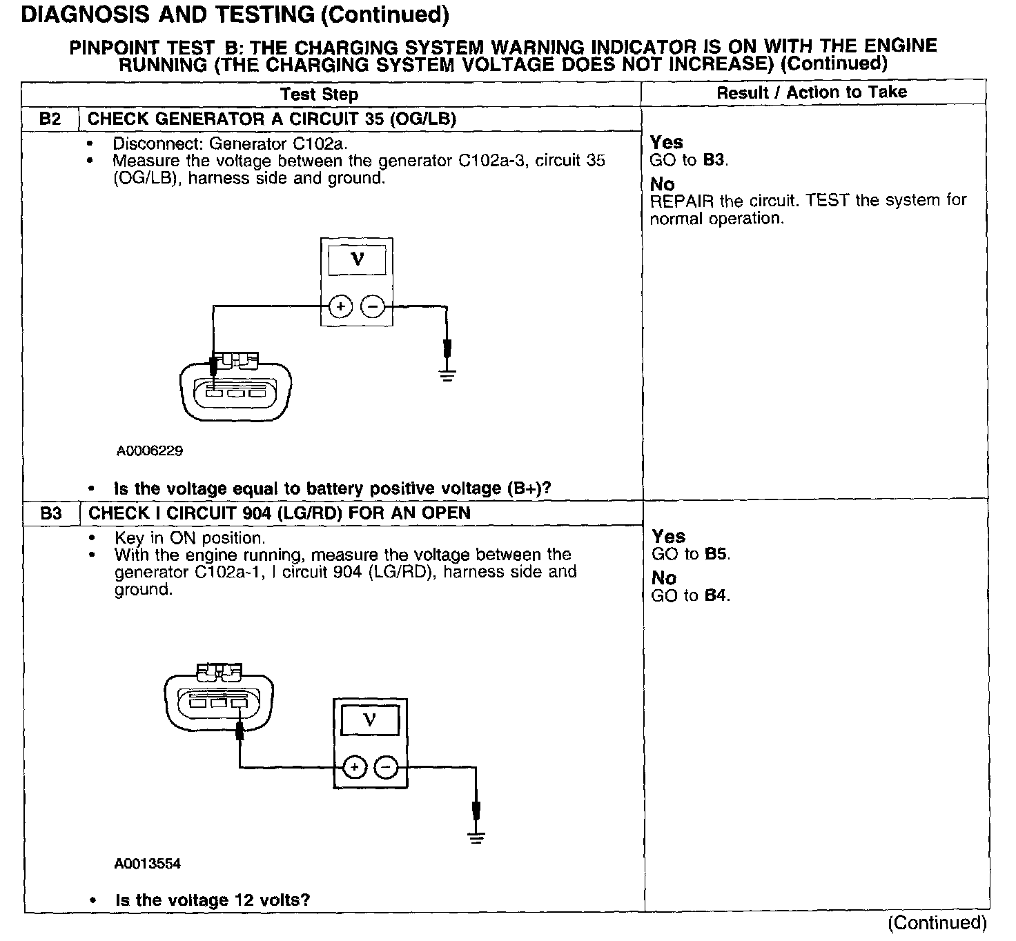 PINPOINT TEST B: THE CHARGING SYSTEM WARNING INDICATOR IS ON WITH THE ENGINE RUNNING (THE CHARGING SYSTEM VOLTAGE DOES NOT INCREASE)