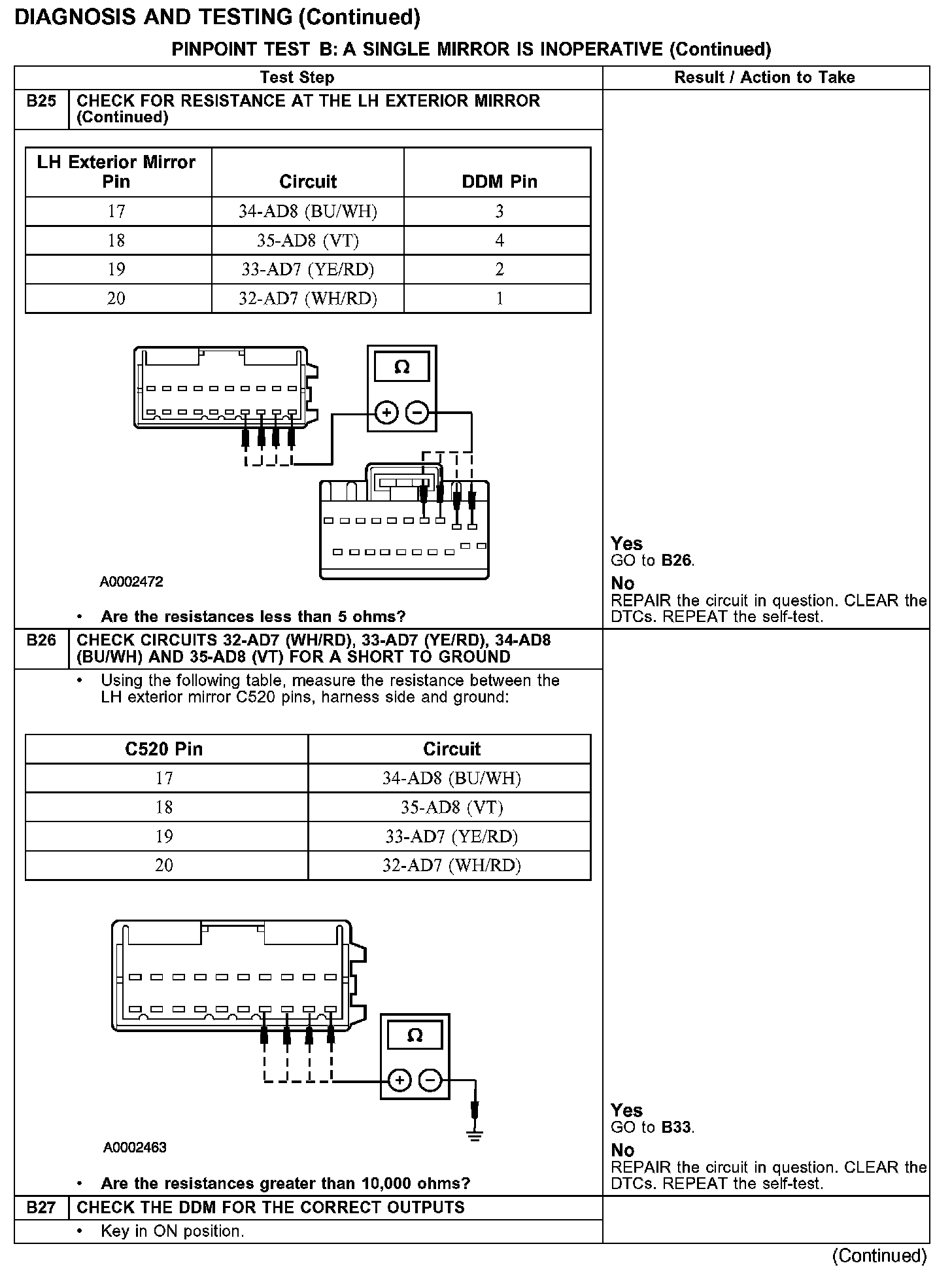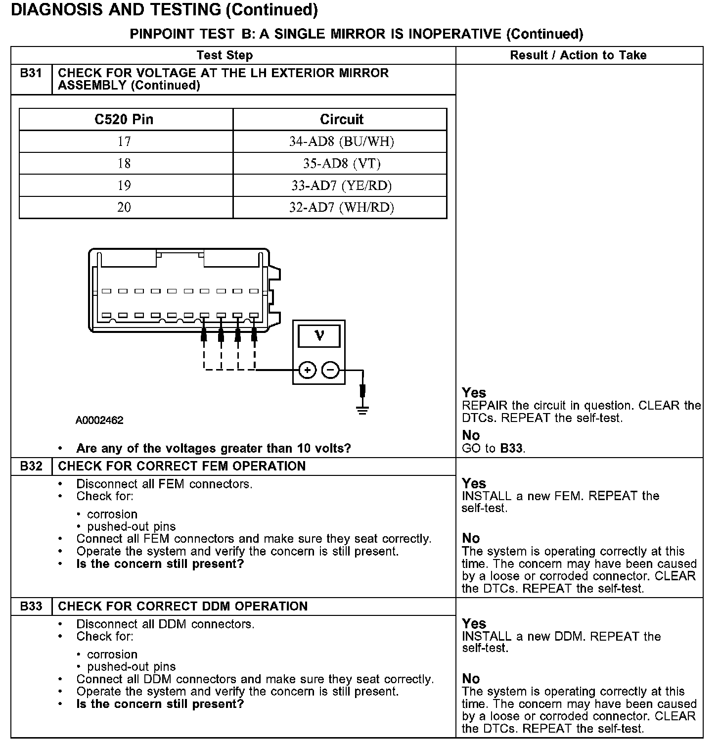 - circuits 32-AD7 (WH/RD), 32-AD10 (WH/BK), 32-AD30 (WH/BK), 32-AD32 (WH/RD), 33-AD7 (YE/RD), 33-AD10 (YE/BK), 33-AD12 (YE), 34-AD8 (BU/WH), 34-AD11 (BU/OG), 34-AD29 (BU/OG), 34-AD31 (BU/WH), 35-AD8 (VT) or 35-AD11 (VT/WH) open.