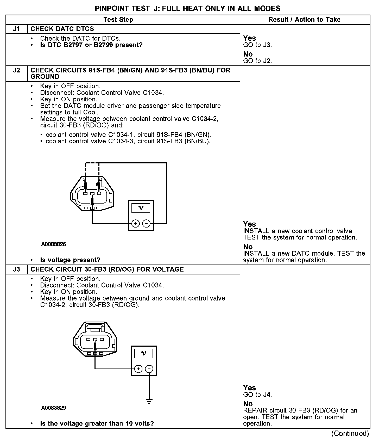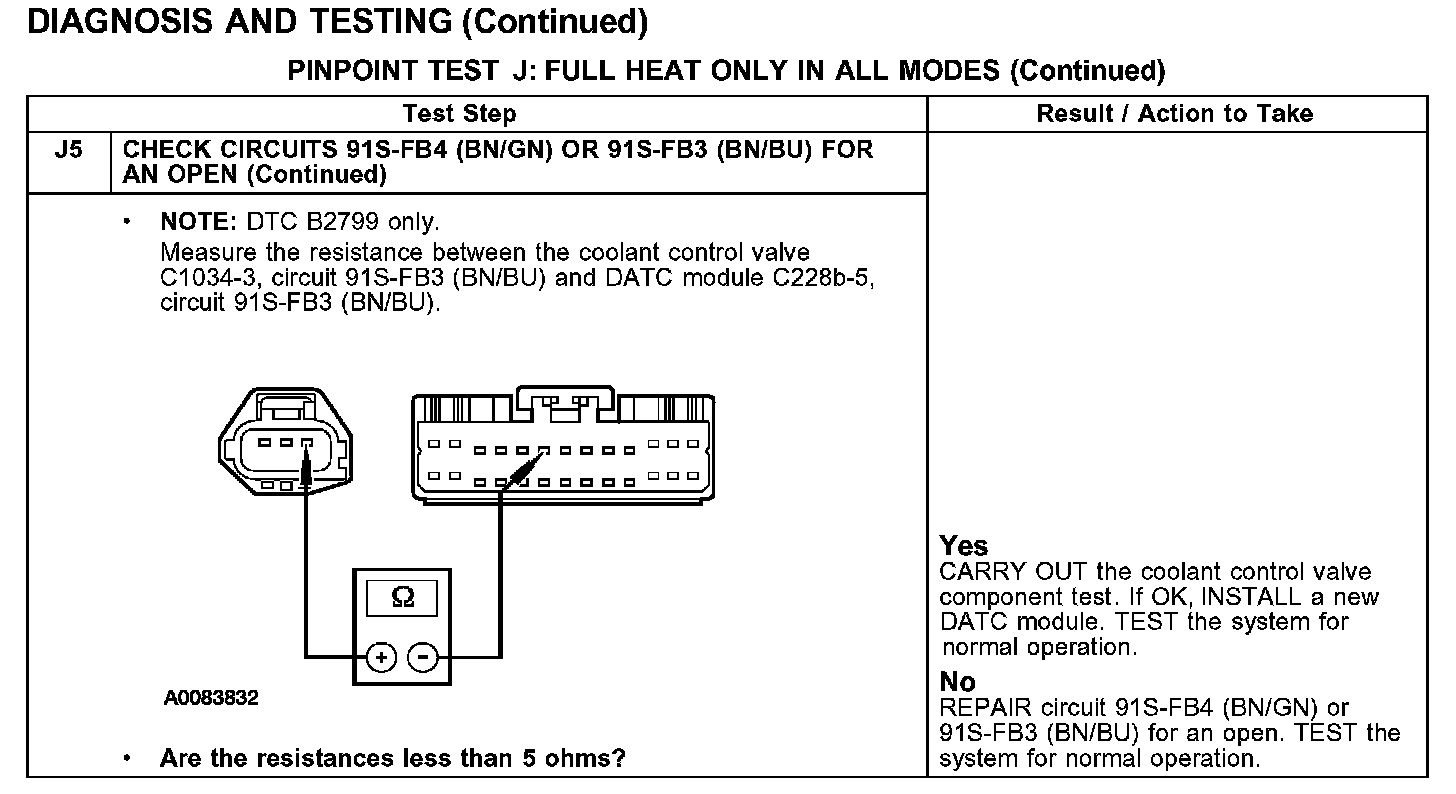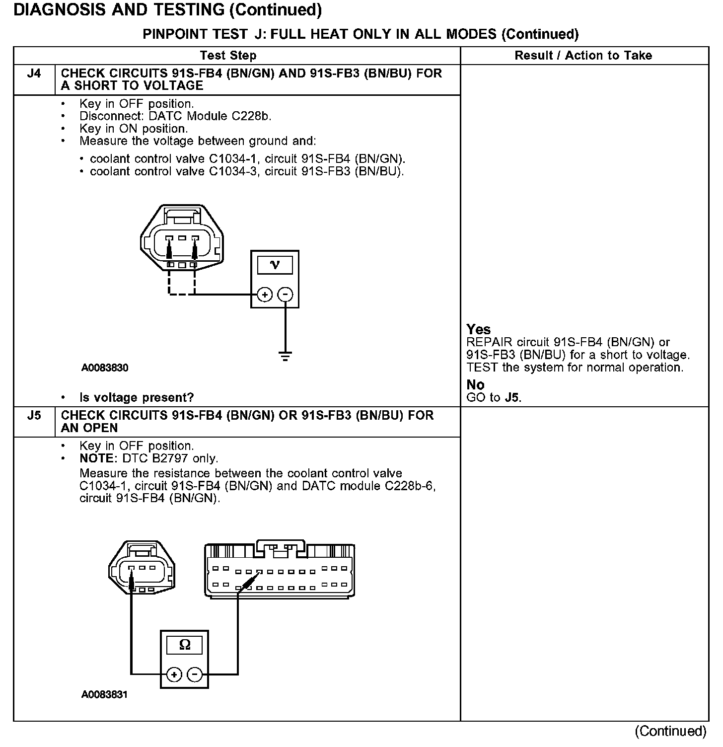 Under normal operation, the coolant control valve receives battery voltage through circuit 30-FB3 (RD/OG)/30-FA1 (RD). The coolant control valve is provided a ground through circuit 91S-FB3 (BN/BL) and/or 91S-FB4 (BN/GN) from the Dual Automatic Temperature Control (DATC) module, depending on which side of the heater core the warm coolant is to flow through.