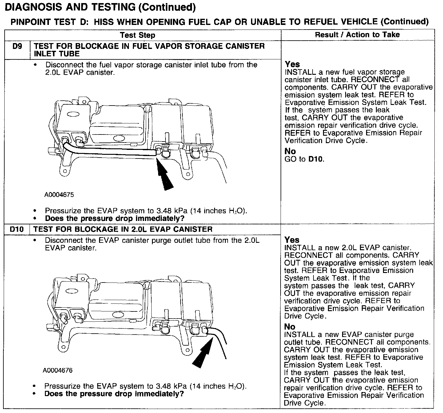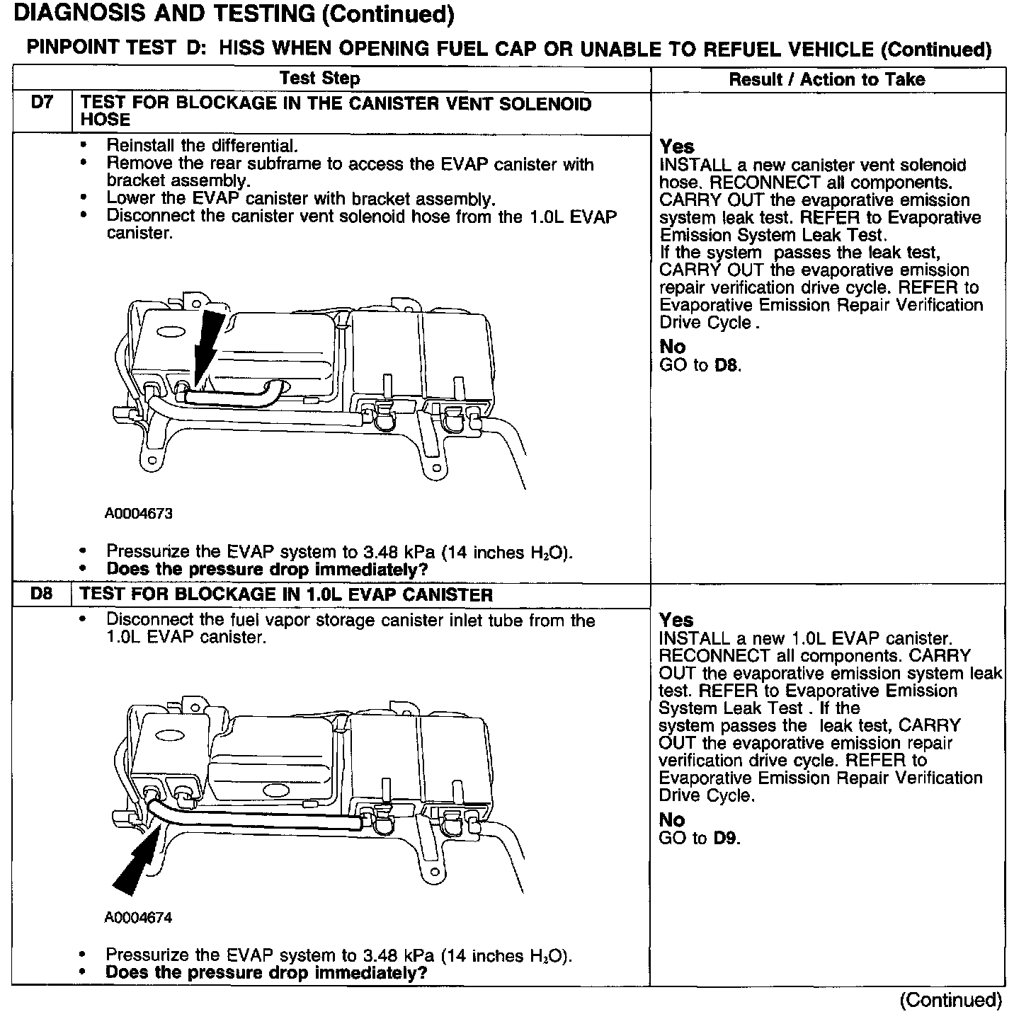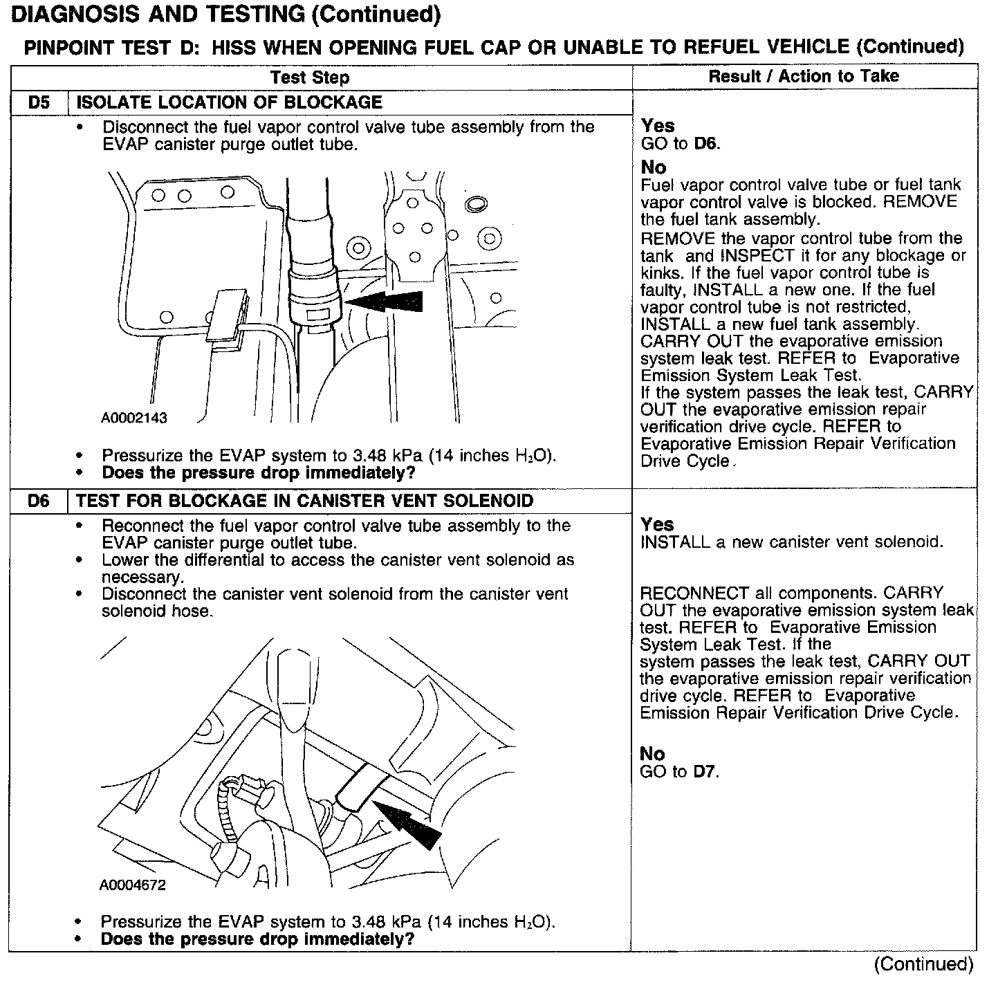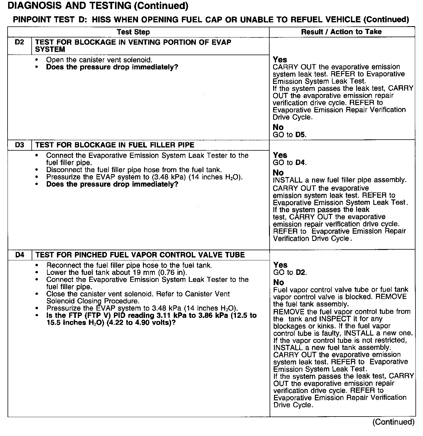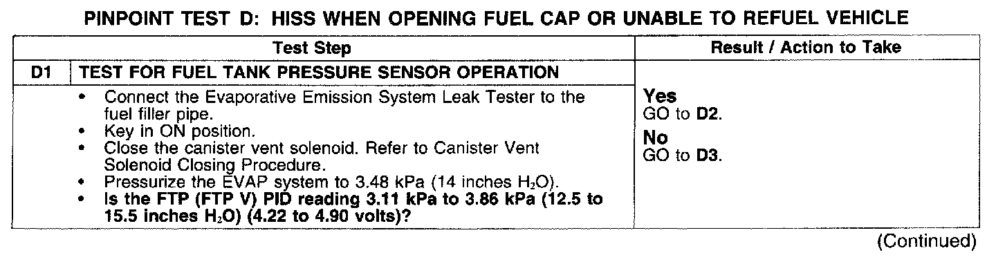 PINPOINT TEST D: HISS WHEN OPENING FUEL CAP OR UNABLE TO REFUEL VEHICLE