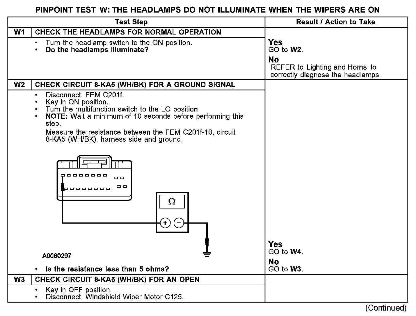 PINPOINT TEST W: THE HEADLAMPS DO NOT ILLUMINATE WHEN THE WIPERS ARE ONTest W1-W3: