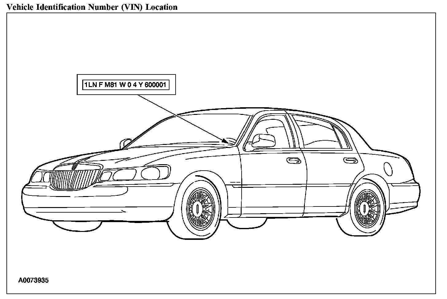 The vehicle identification number (VIN) is a seventeen-digit combination of letters and numbers. The VIN is stamped on a metal tab riveted to the instrument panel, top upper left of the dash. The VIN number is also found on the vehicle certification (VC) label.