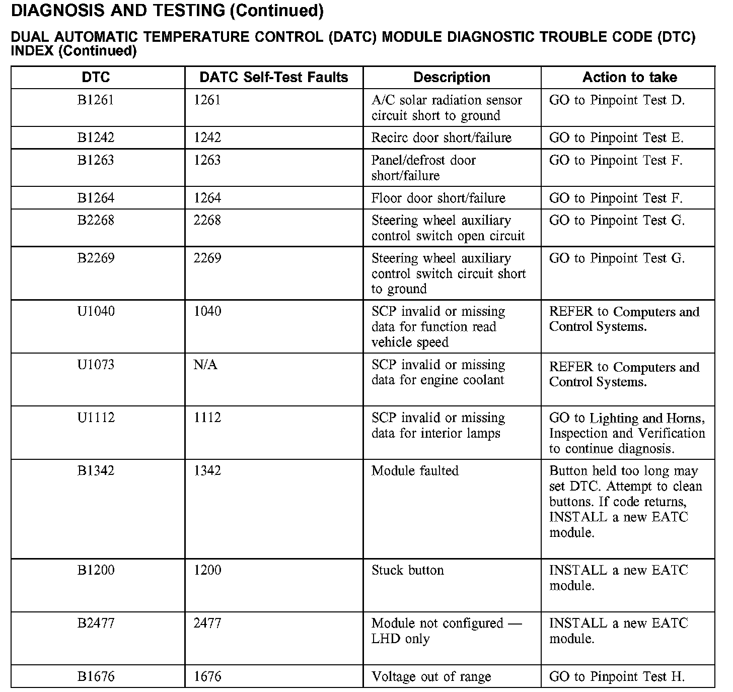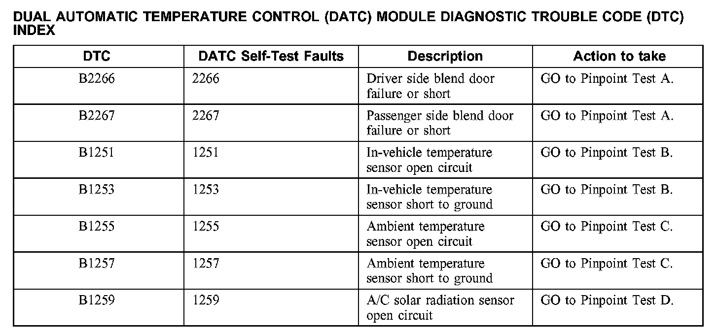 DUAL AUTOMATIC TEMPERATURE CONTROL (DATC) MODULE DIAGNOSTIC TROUBLE CODE (DTC) INDEX