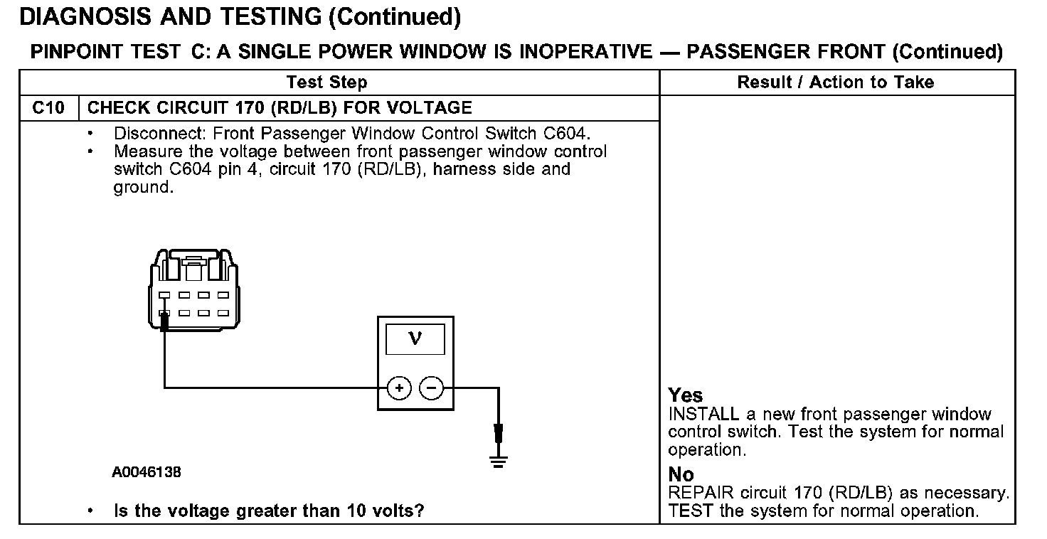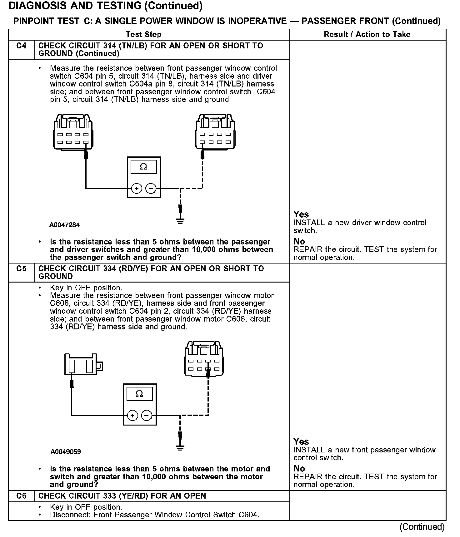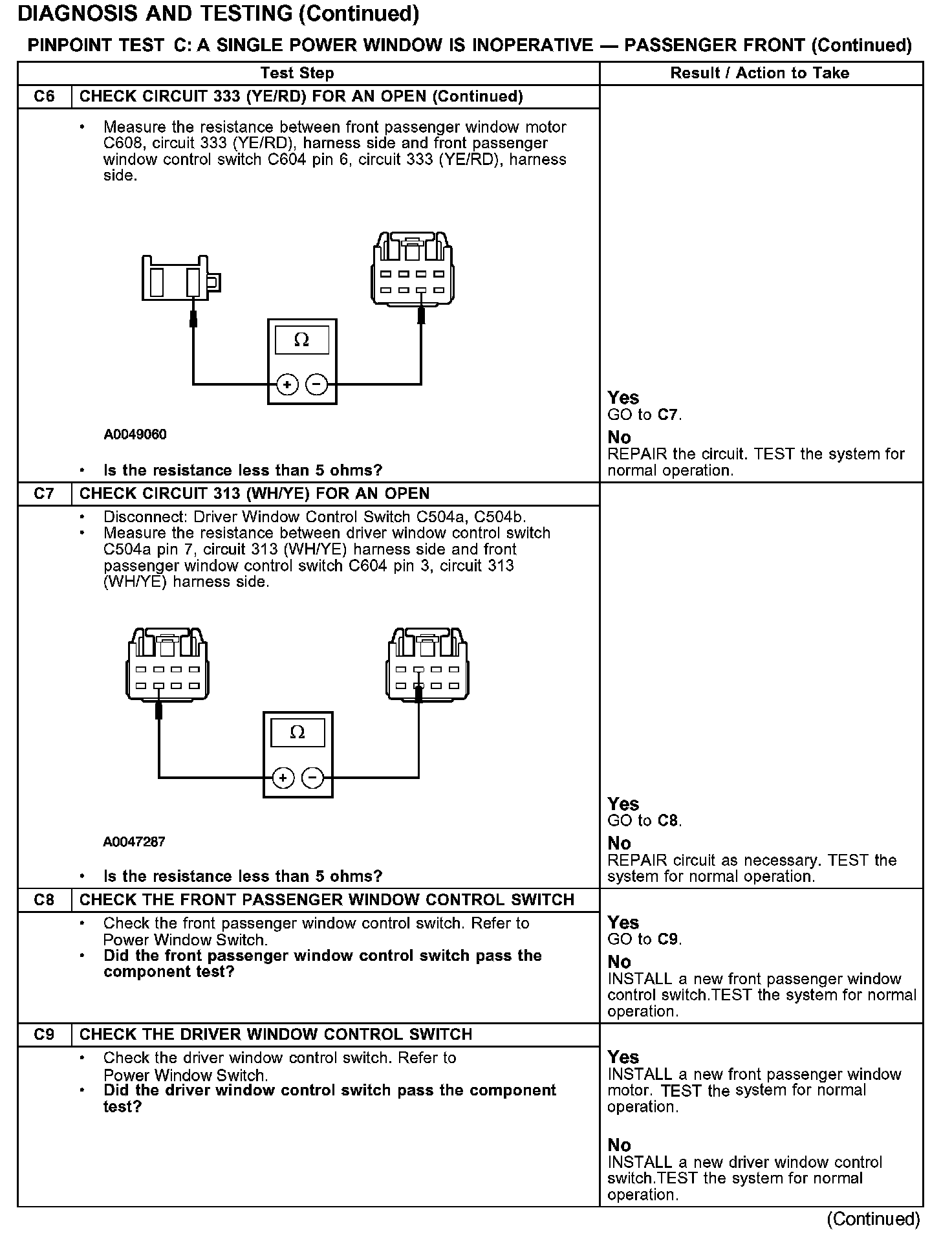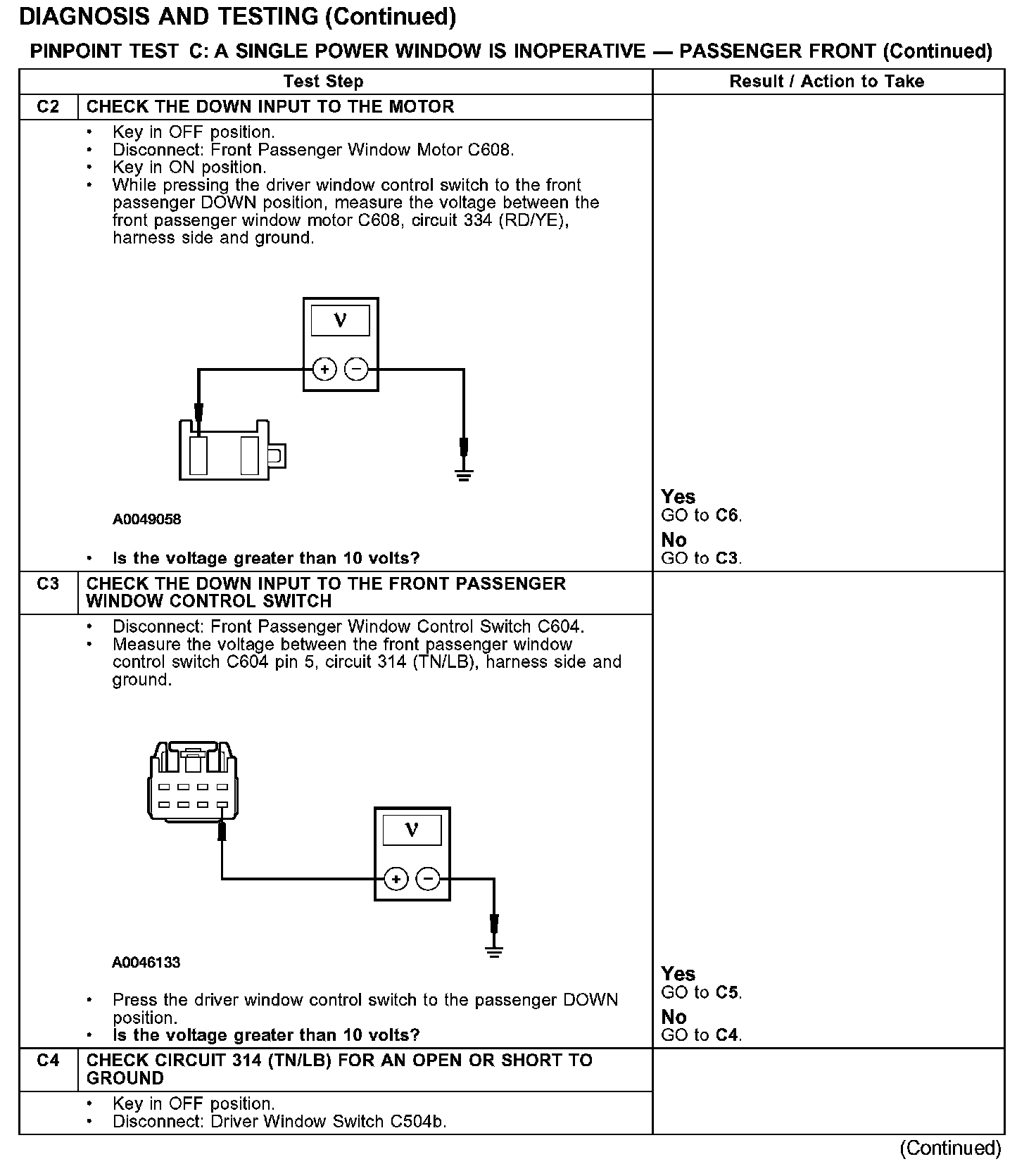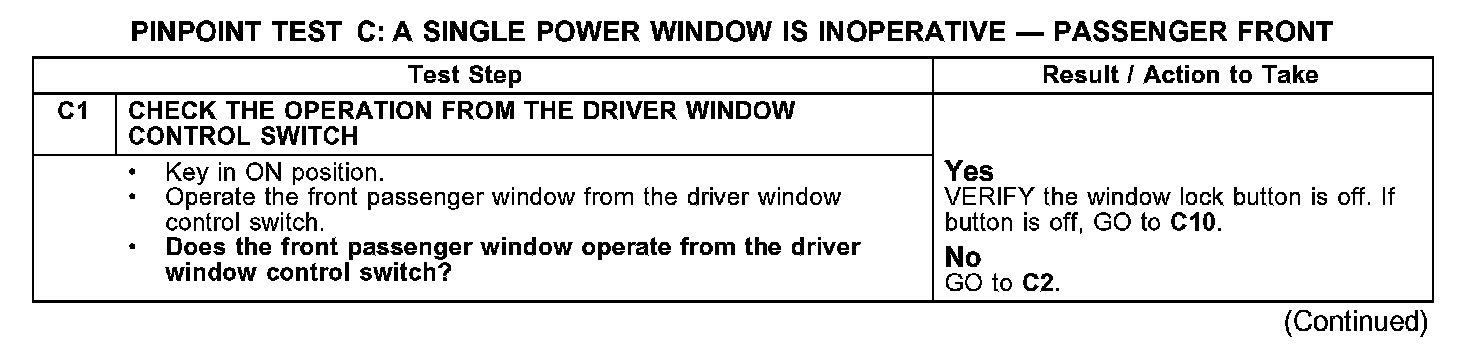 PINPOINT TEST C: A SINGLE POWER WINDOW IS INOPERATIVE - PASSENGER FRONT